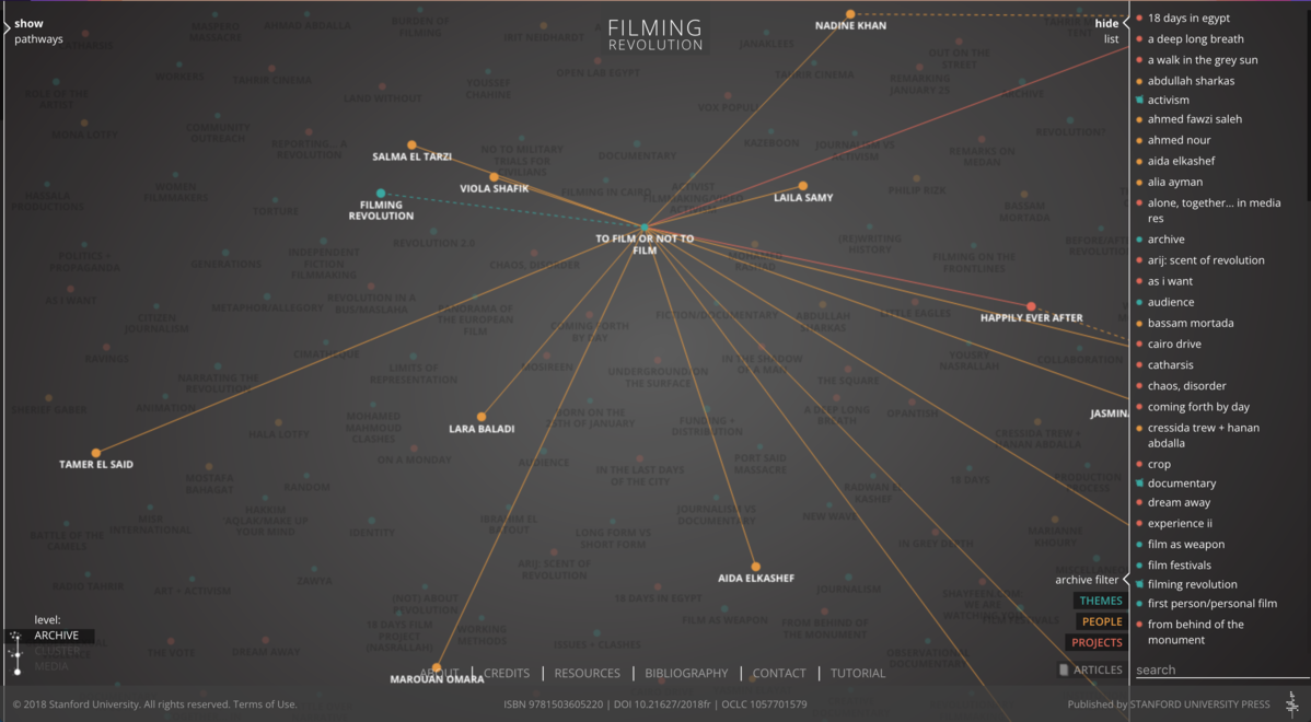 Interfaces might provide interpretive paths, highlight themes, provide a visual rendering of the relationships between elements, facilitate moves between macro and micro engagements with the database, and establish a documentary style.