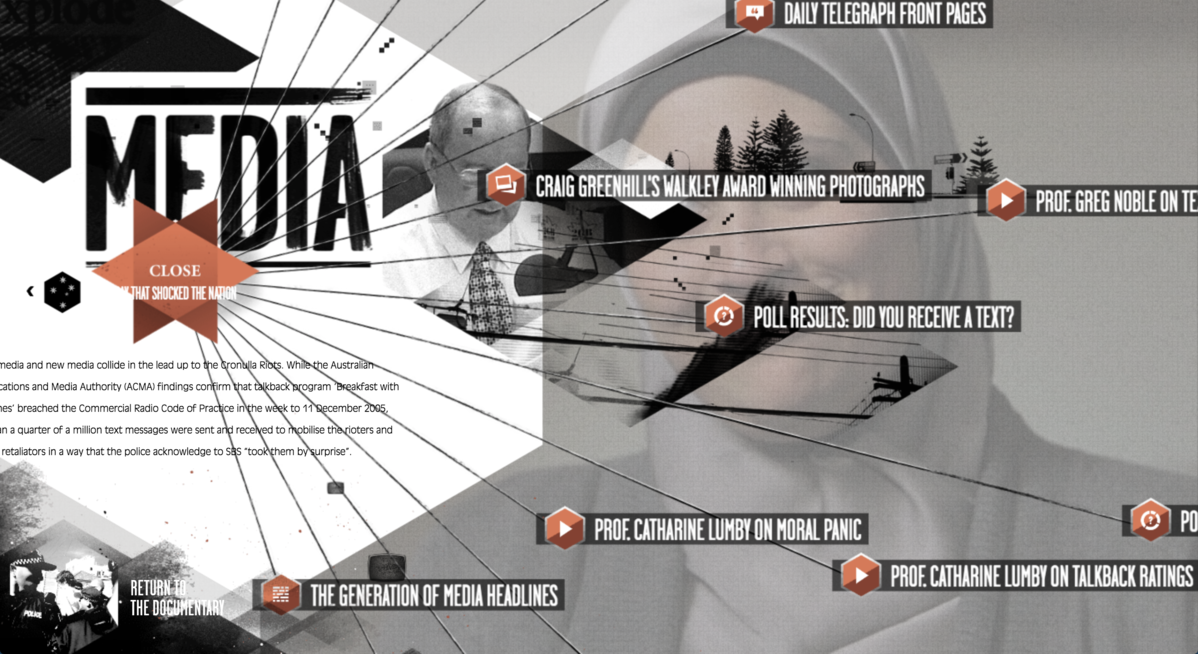 Cronulla Riots: The Day that Shocked the Nation takes a categorical approach, in combination with modes of narrative engagement, to draw attention to various factors that sparked race riots in the Sydney suburb of Cronulla in 2005. The database invites multiple modes of engagement. Exploring a map and timeline of police reports invites a modular engagement with the events as narrative, challenging the user to connect events to produce a story of ‘what happened’.