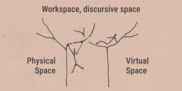 - We will be thinking and working together, producing circulation, exchanging artefacts and notations, at times making common exercises, but they will be allowed to develop in their own proper time and rhythm. The co-presence is established as a form that extends beyond day-to-day activities, while traces can be left in the workspaces (or handed over) and reacted upon by others. If we determine a common rudiment machinery (dispositif), this will be a condensation point where the different ideas and practices meet.