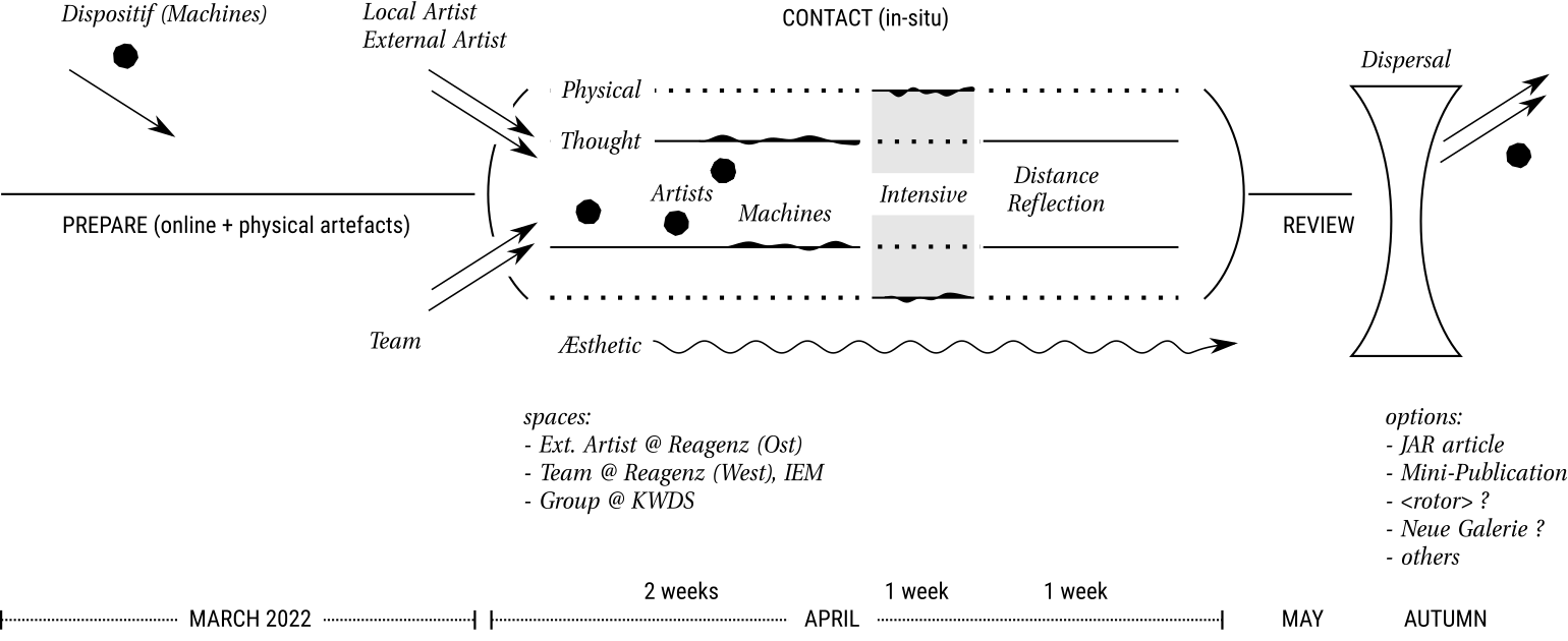 What initiates the intensive exchange of the Contact Phase? Each artist-researcher brings in questions, material, experience, strategies that is important to them, putting them into relation to rudimentary concepts emerging from the preparatory group process. We propose a number of “method stubs”, open to extension by suggestions coming from the artist-researchers and their experience: