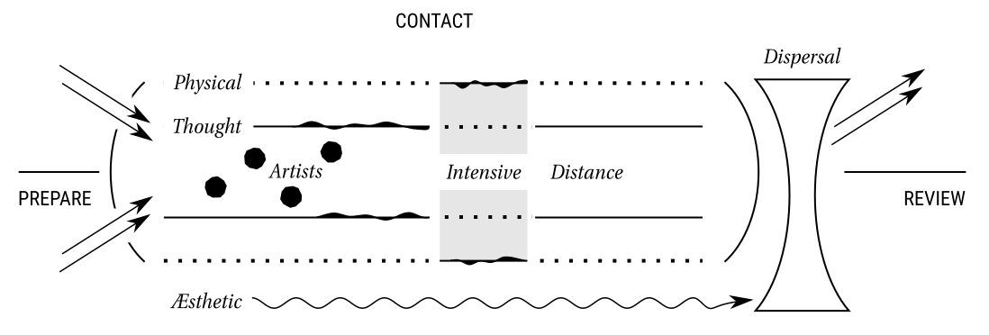 What if collectivisation and dependence are routed in temporal regimes of tight coupling and synchronisation, and we imagine a different temporal regime—simultaneity—as an enabler or warrantor for preserving and fostering multiplicity and otherness within an artistic endeavour? Then it will be necessary to develop a concept of simultaneous work that does not reduce to the utilitarian work next-by-next, as indicated for a residency or group exhibition. A form of contact must be embedded in the concept; this was previously condensed in the two word construction simultaneous arrival. It points at the necessity of a site where people and things come together. It points to the importance of spaces, their affordances and conditioning.