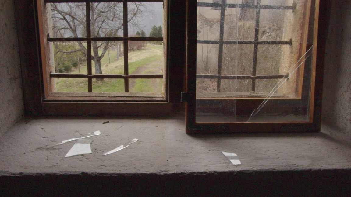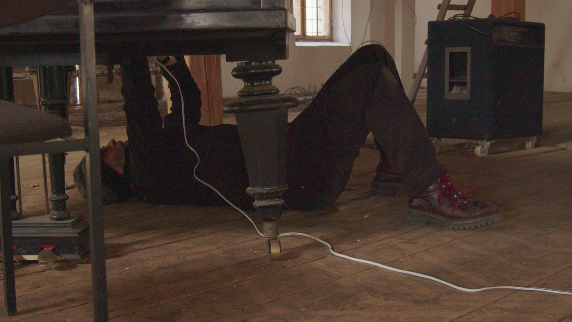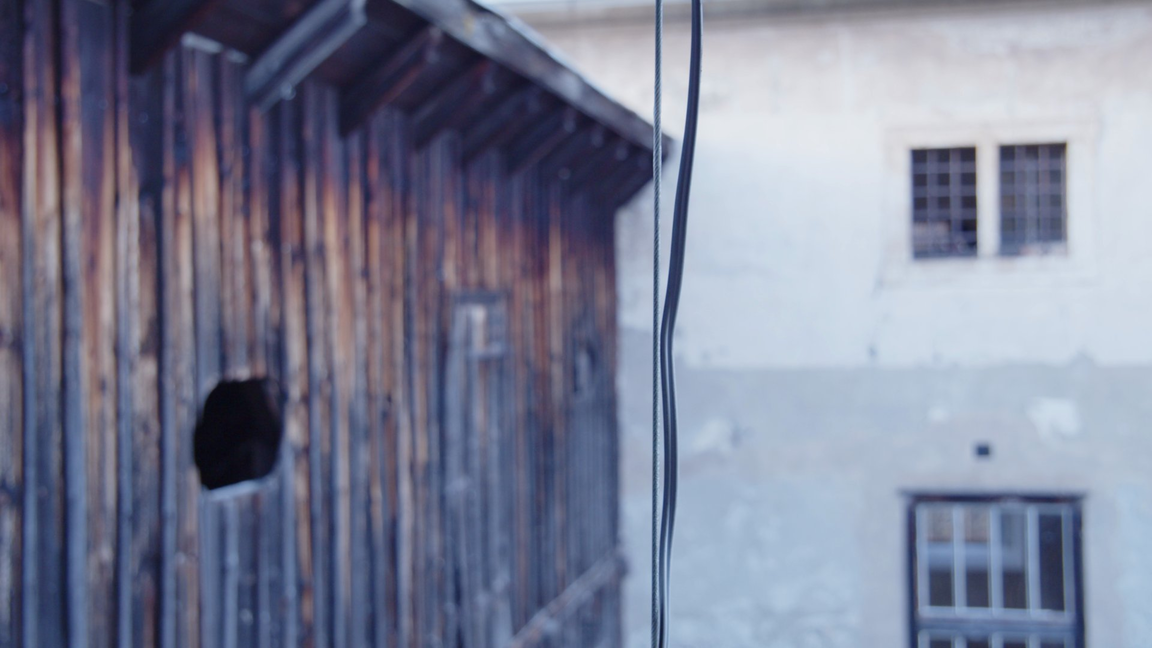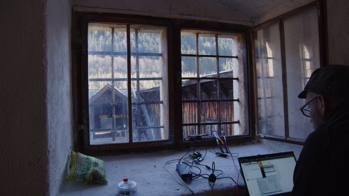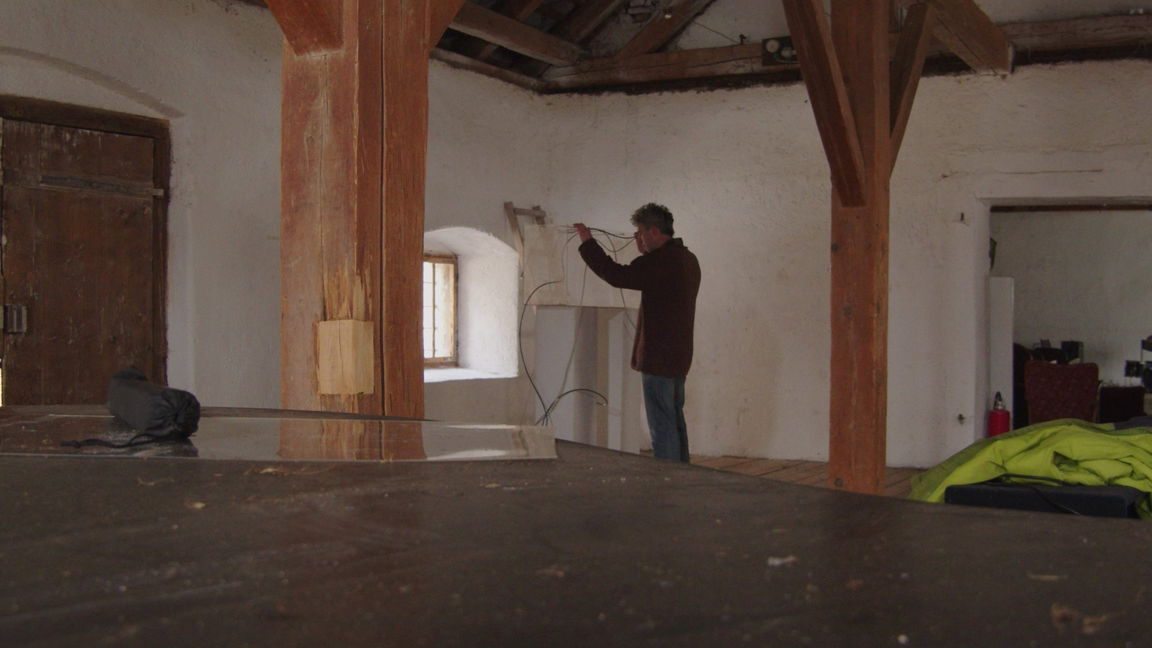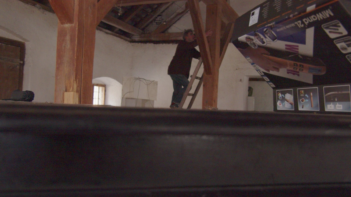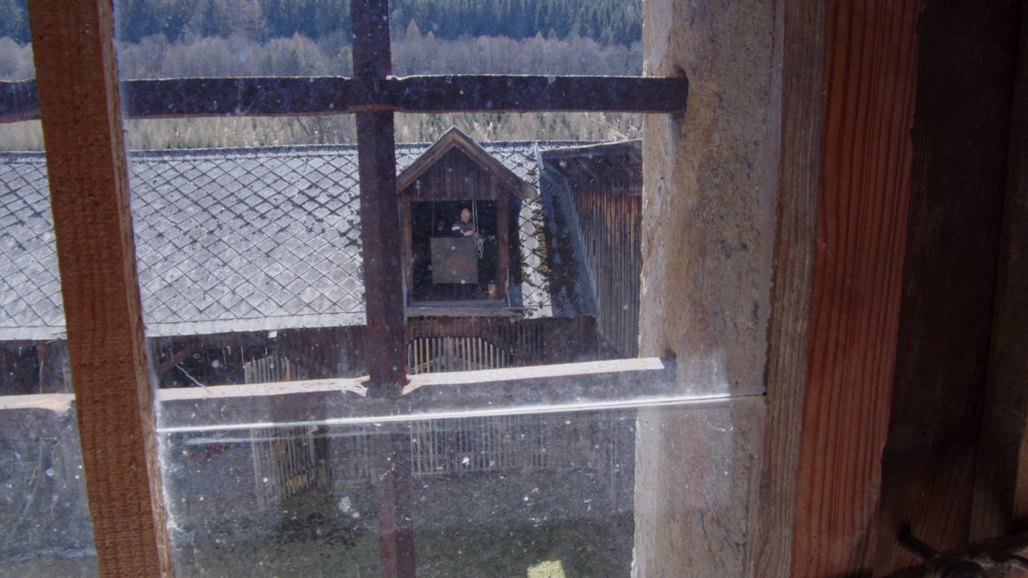 Back on the main storehouse, Hanns is turning the visual line across the yard into an acoustical line, trying to pick up the remote sound via a microphone placed in the window frame.
