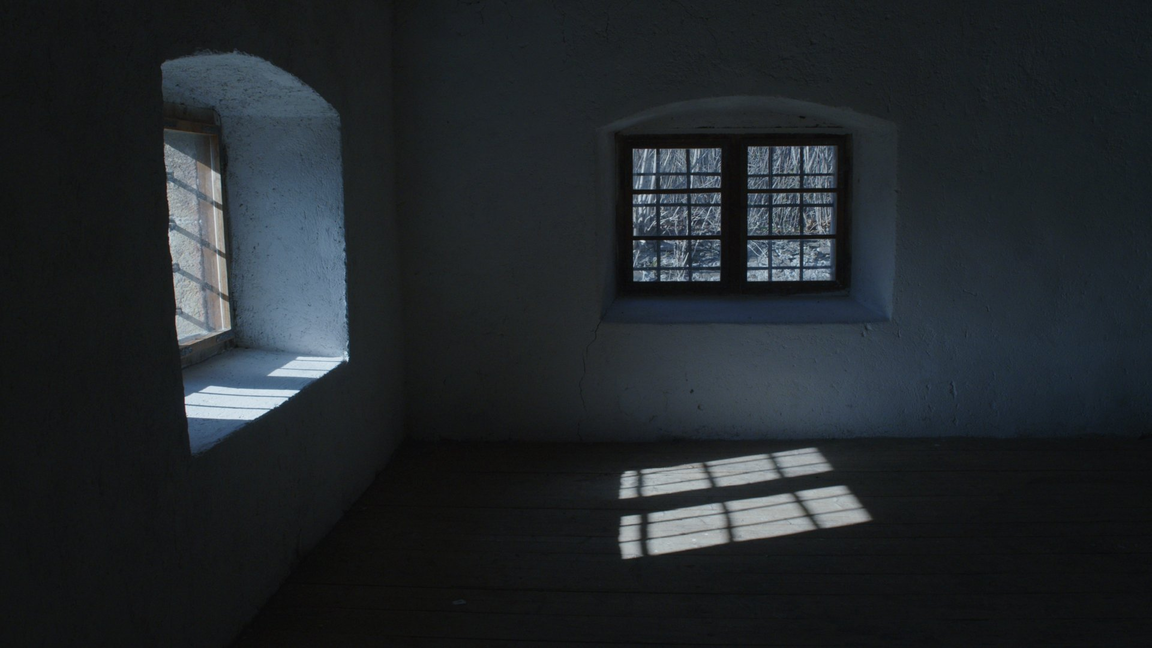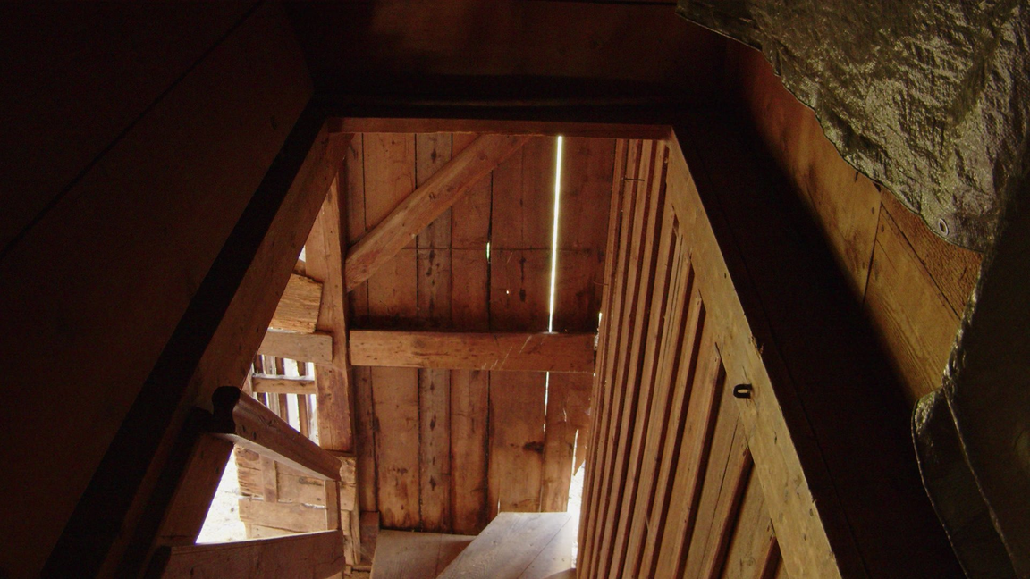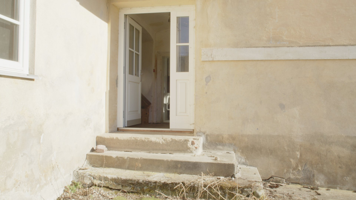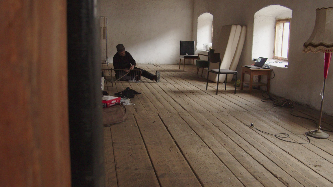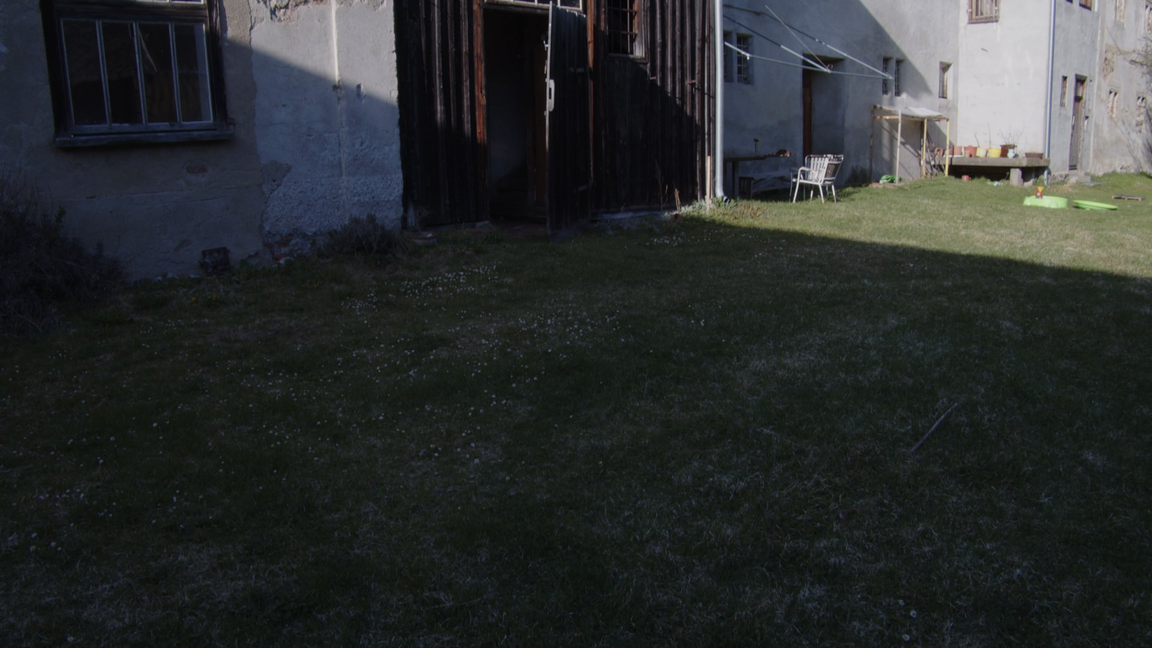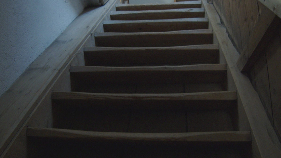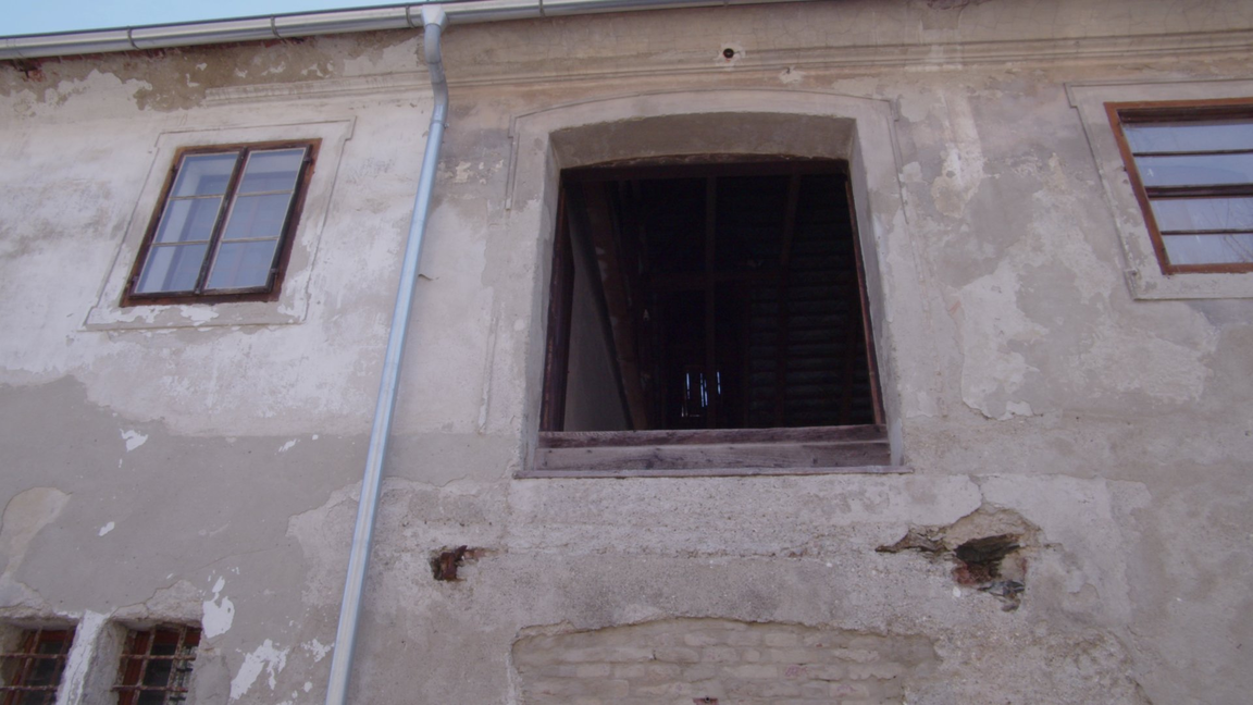 Back on the main storehouse, Hanns is turning the visual line across the yard into an acoustical line, trying to pick up the remote sound via a microphone placed in the window frame.