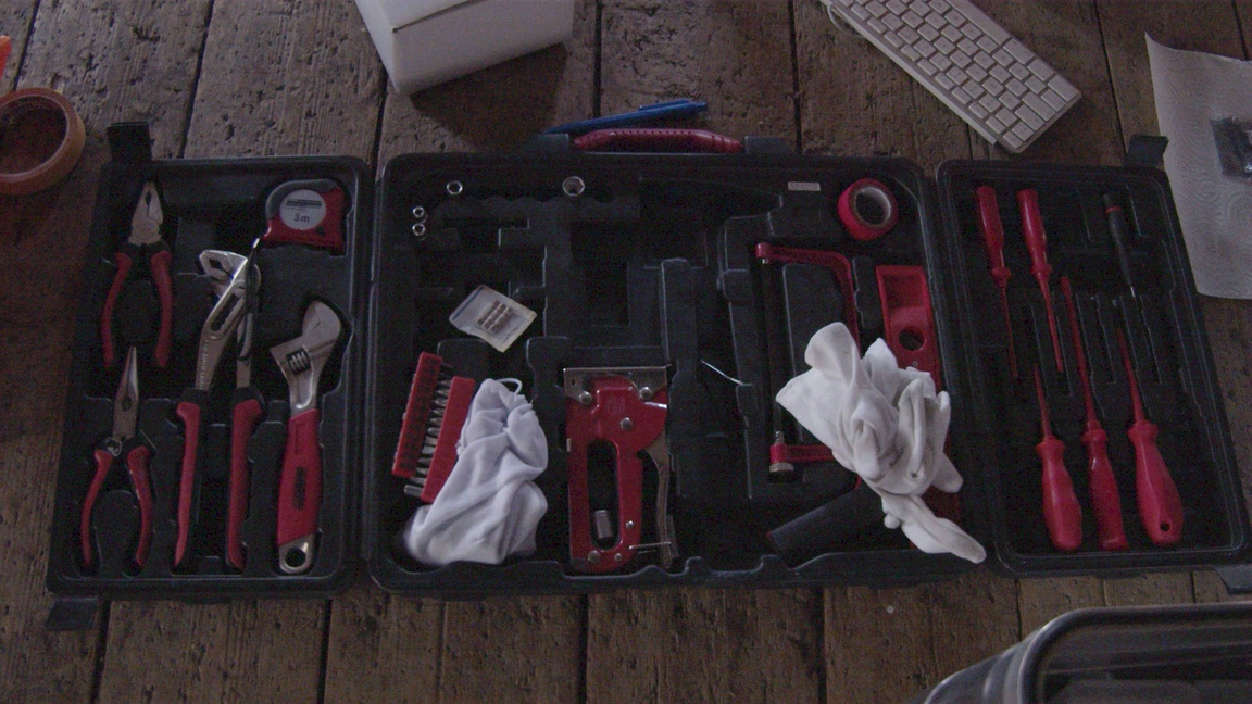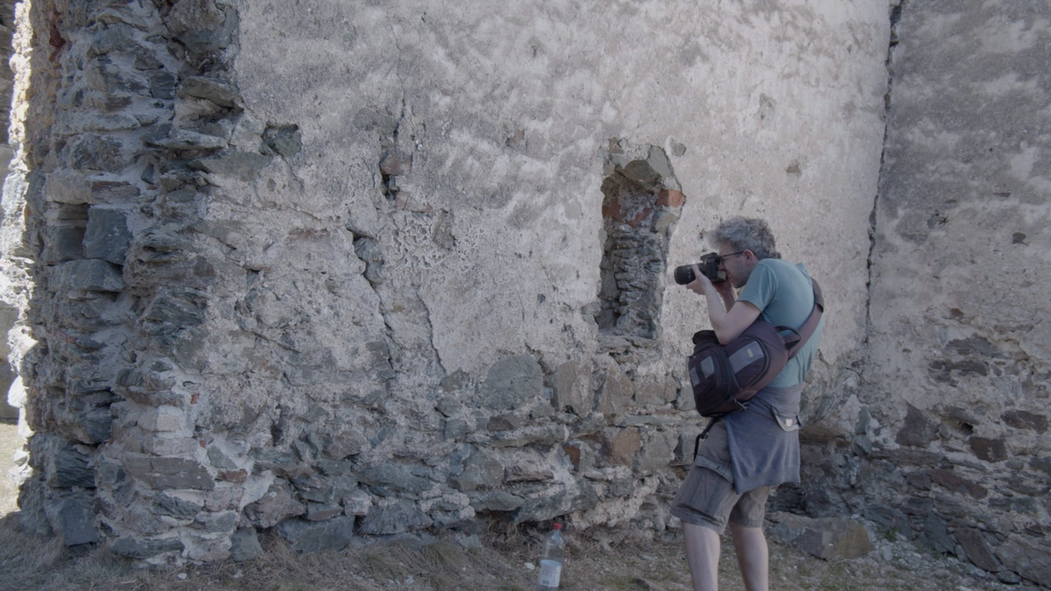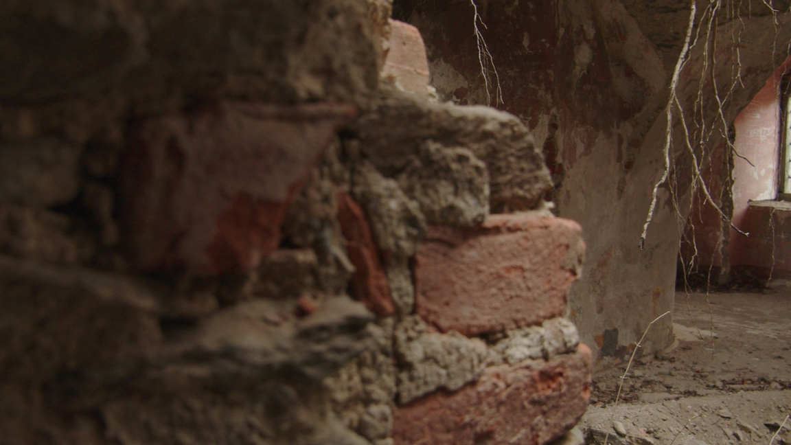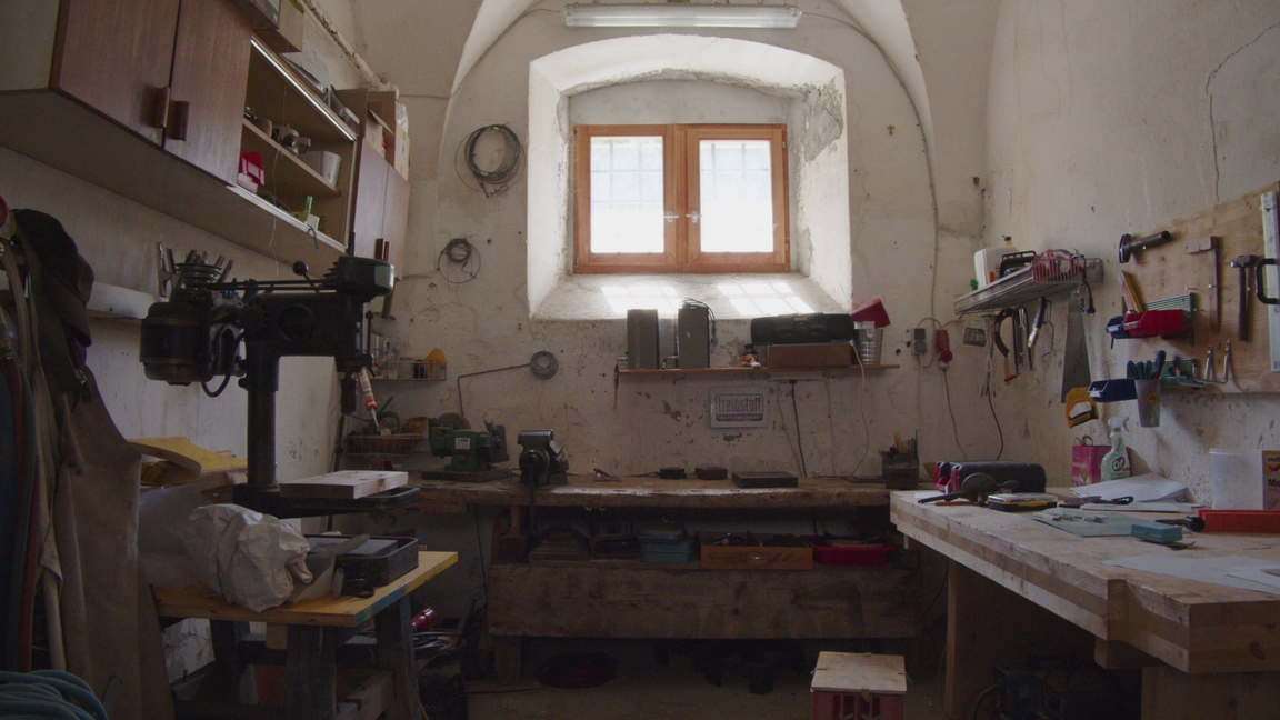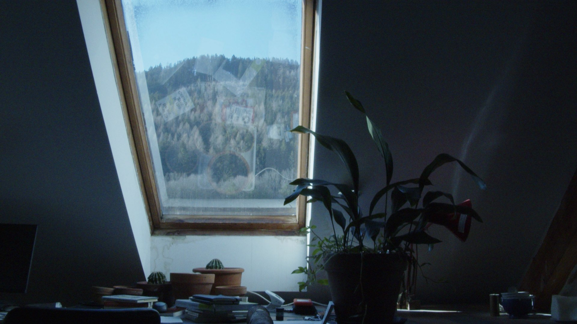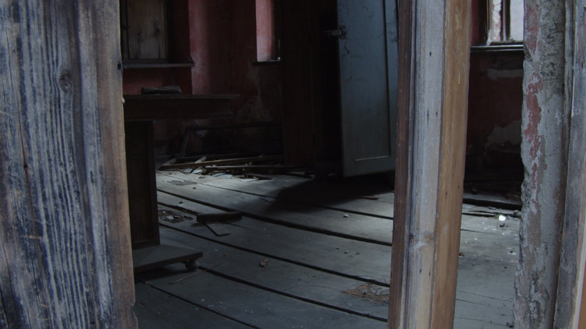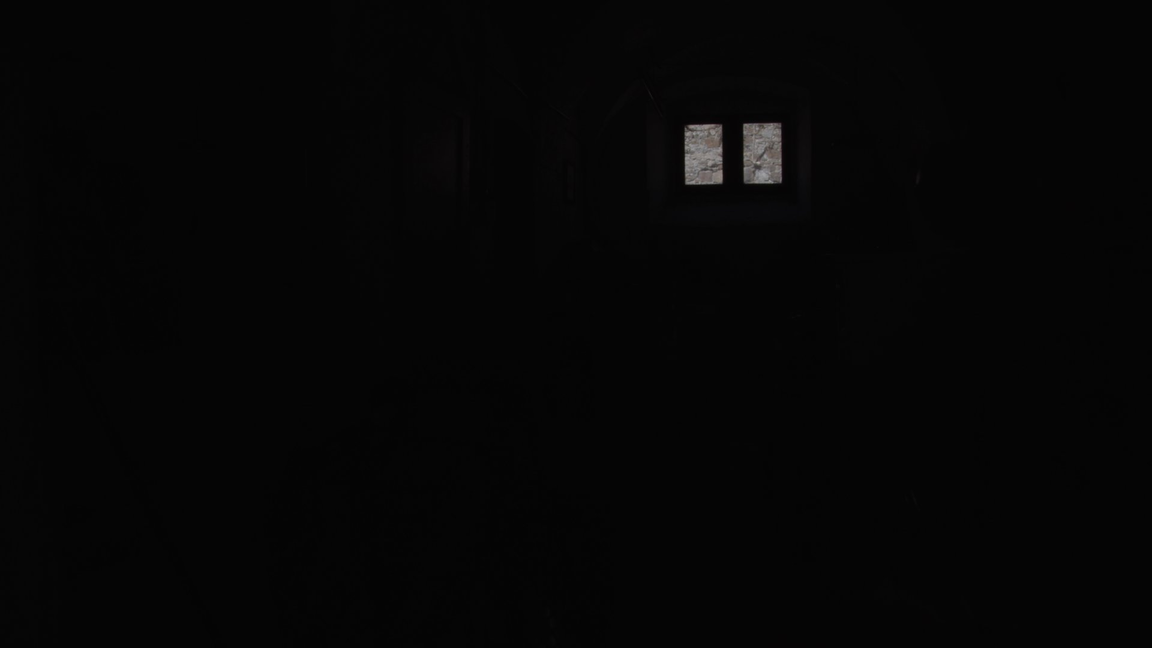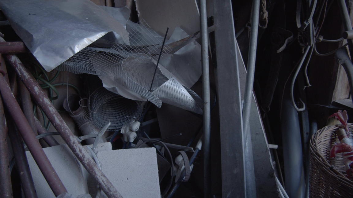 Back on the main storehouse, Hanns is turning the visual line across the yard into an acoustical line, trying to pick up the remote sound via a microphone placed in the window frame.
