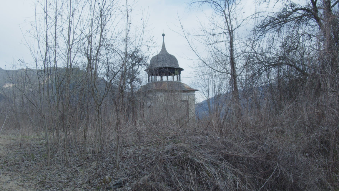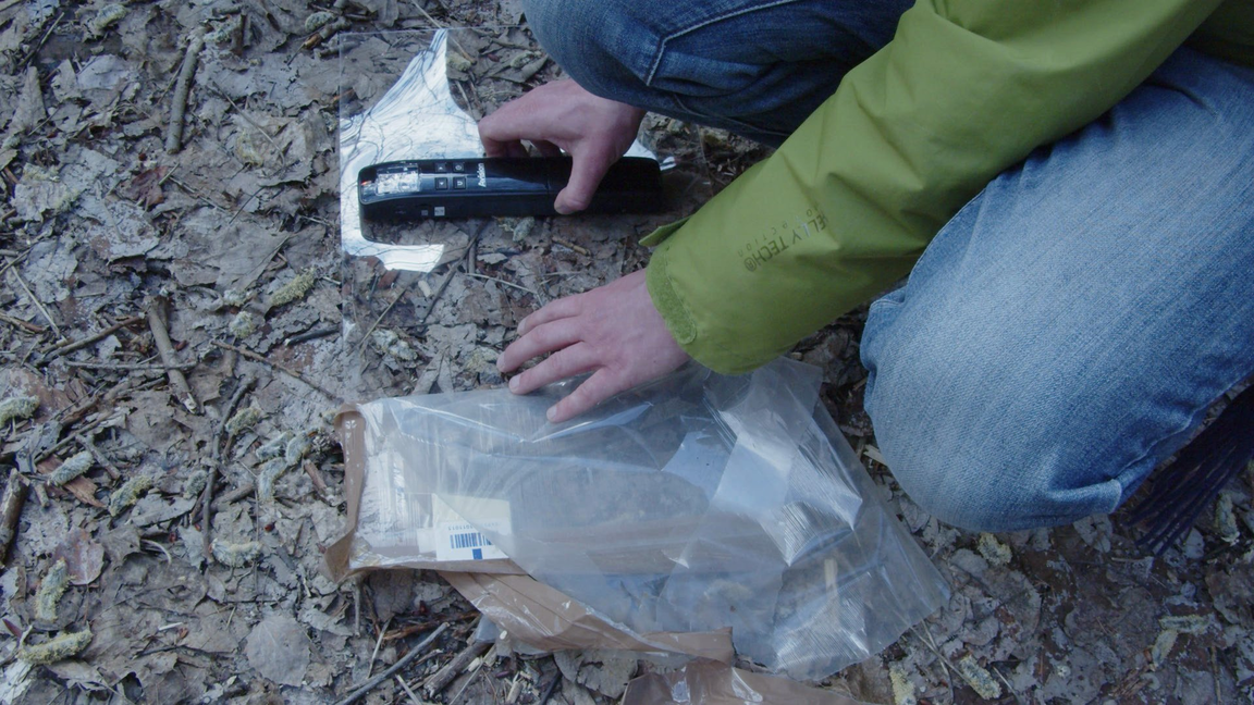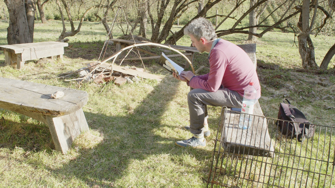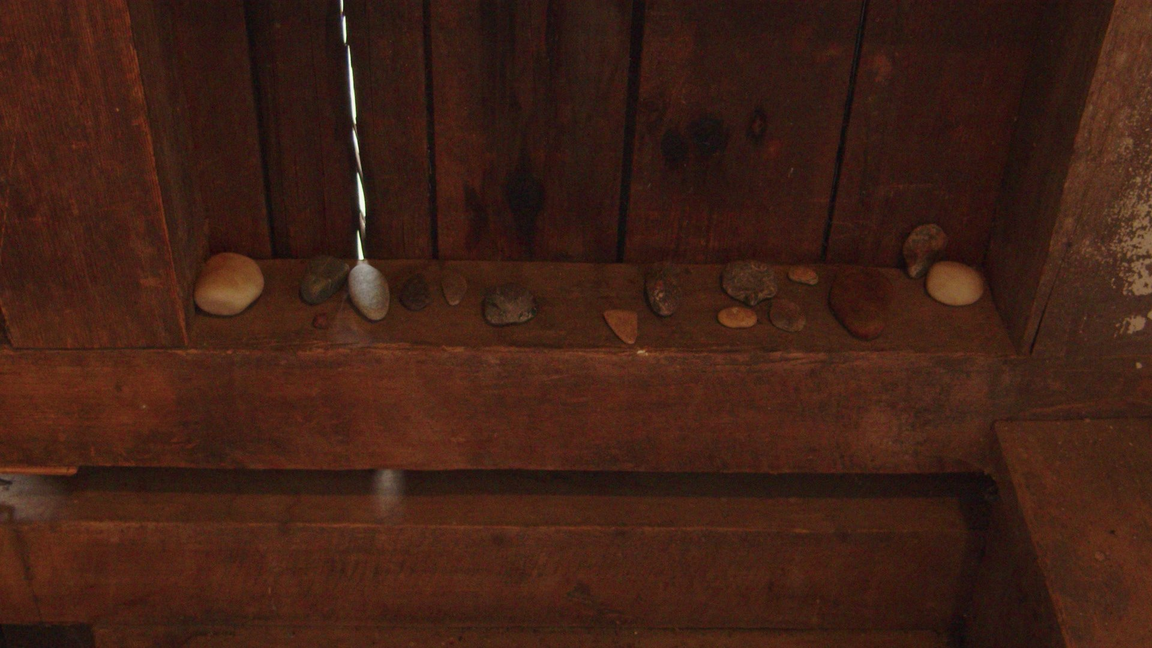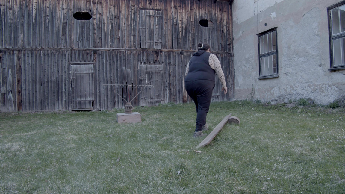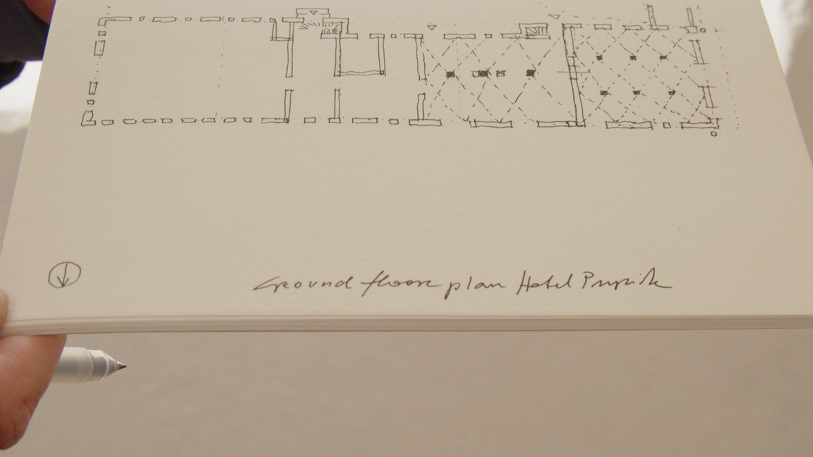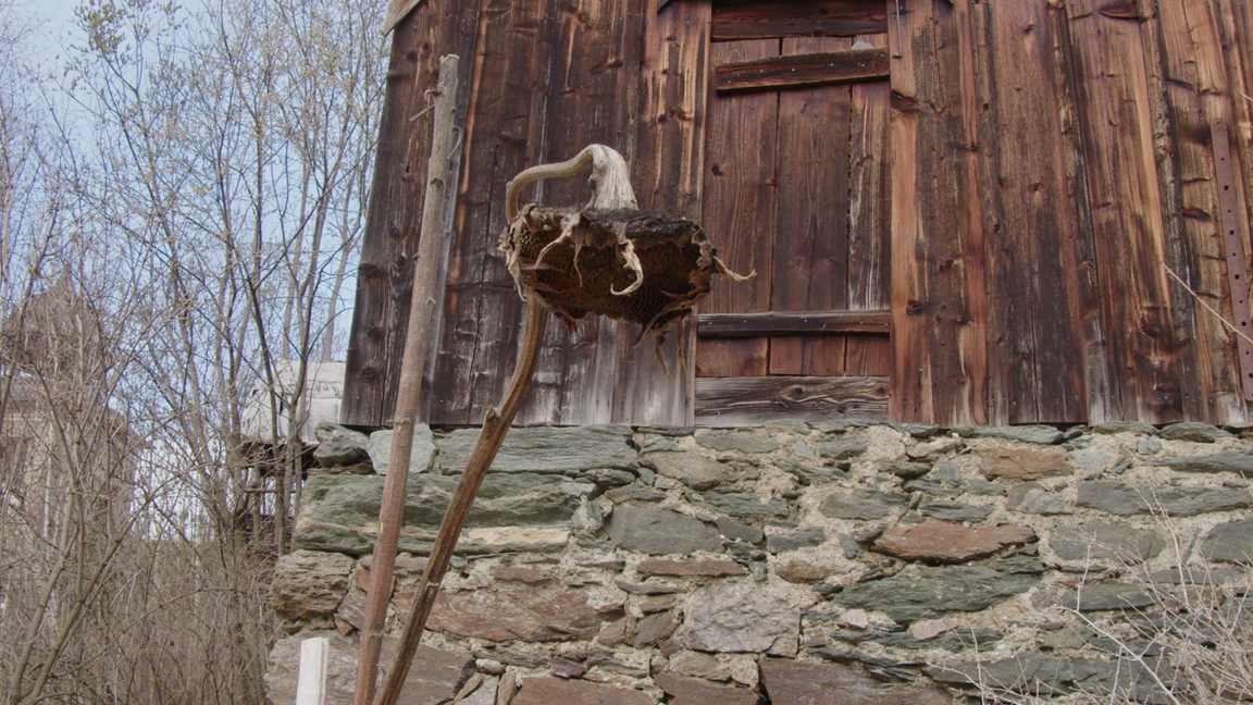 Back on the main storehouse, Hanns is turning the visual line across the yard into an acoustical line, trying to pick up the remote sound via a microphone placed in the window frame.