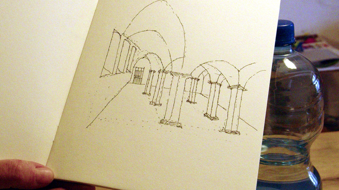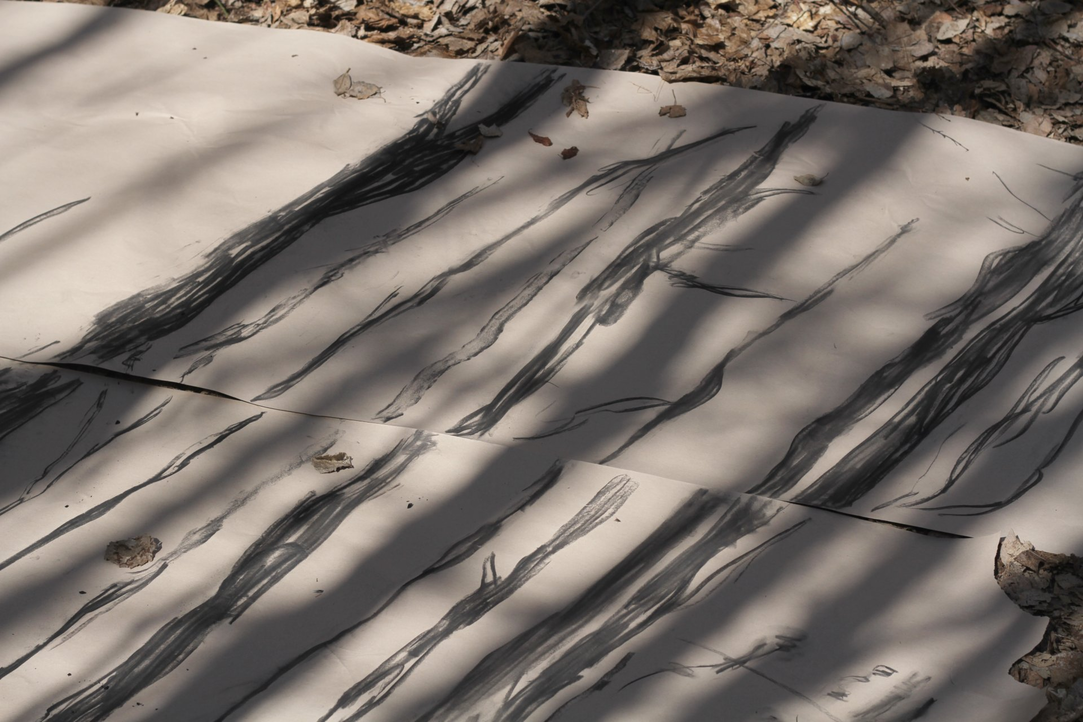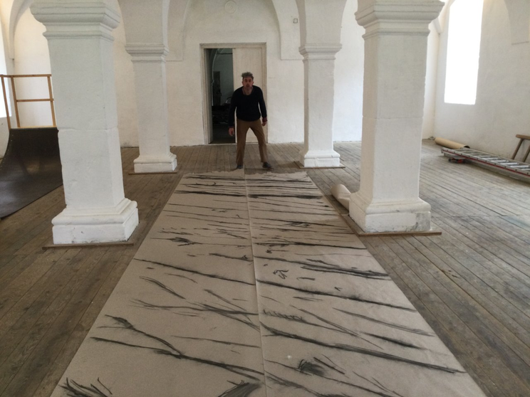 Shane was working on long paper lanes laid out around the castle ruins, tracing the branches and shadows.