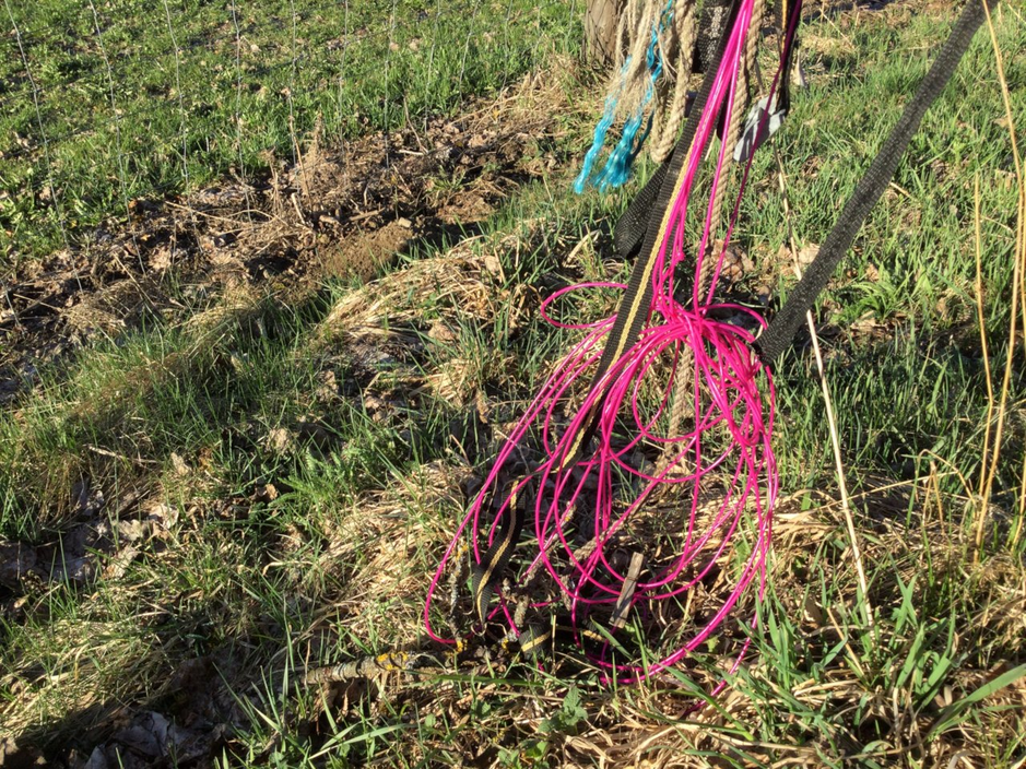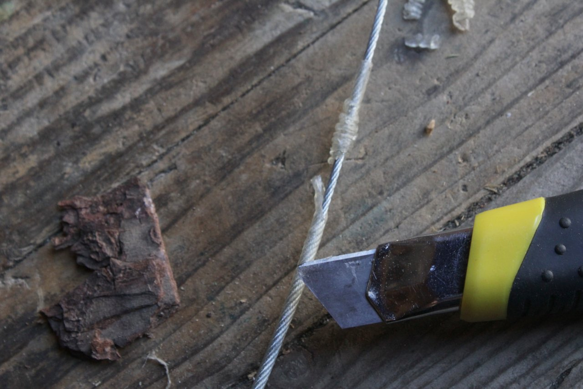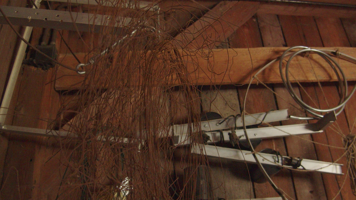 … or we revert to the basic tools, stripping plastic insulation from steel cable found in one of the sheds.