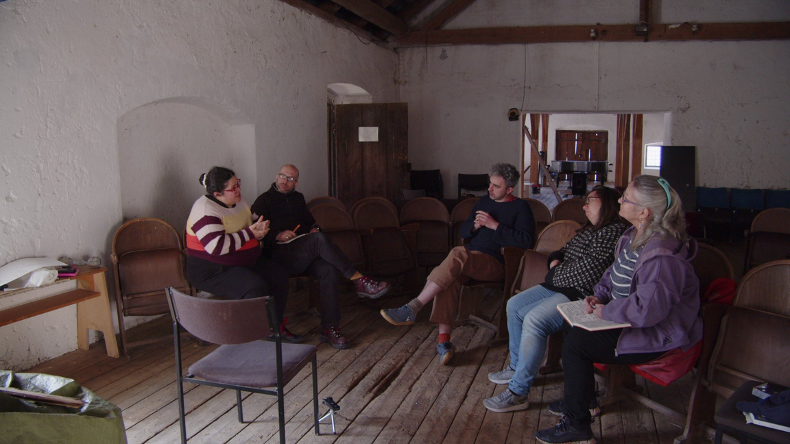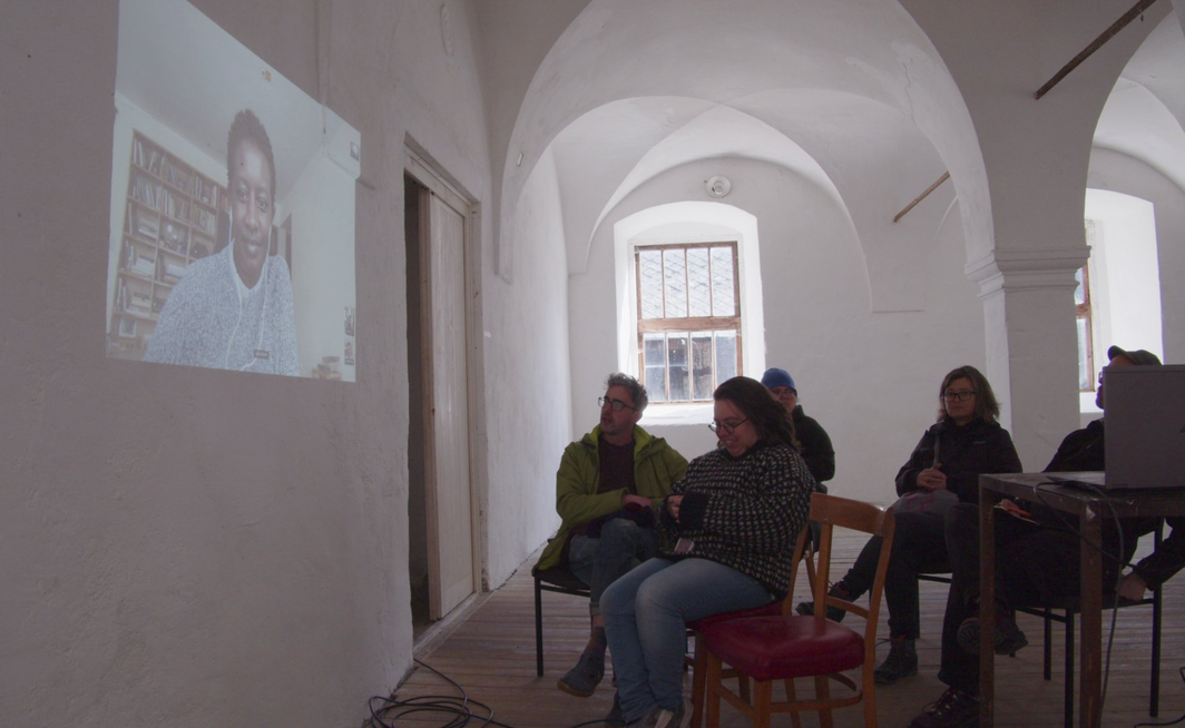 We decided to move our group meetings to a new space every time. After trying to improvise in the “cinema” space, lack of cables and unsuitable projector distance made us quickly set up in the barn, throwing the image of Jackie, connected via Jitsi, on one of the walls.