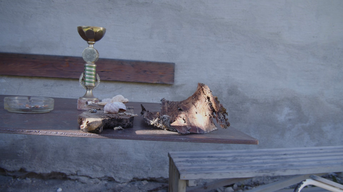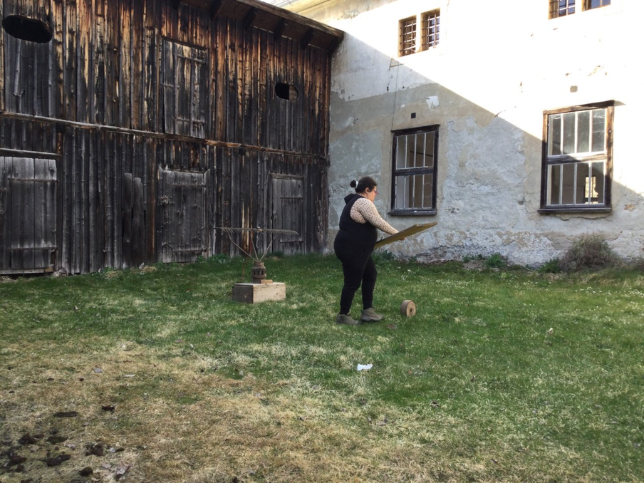 The yard installation is now completed with a sound layer, using voice recordings of the text “tercas” written by Nayarí. The voices of Naya and Hanns are heard simultaneously from the rake and from the wooden plank. We recorded the text in Spanish, English, and German; for now, we decided to stay with the Spanish version.
