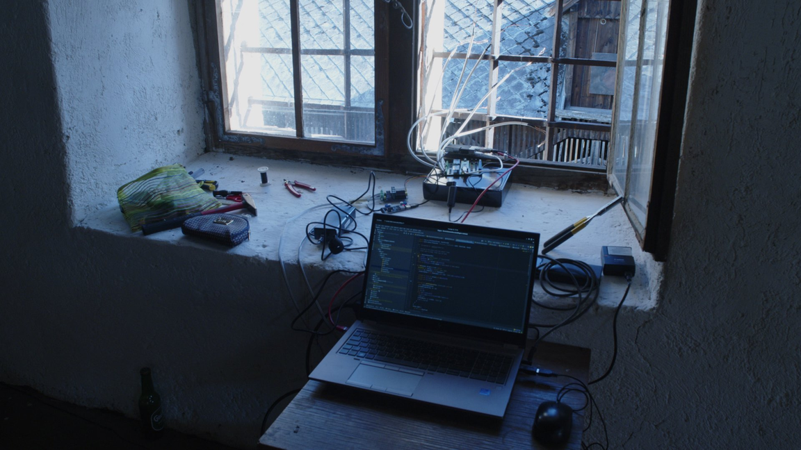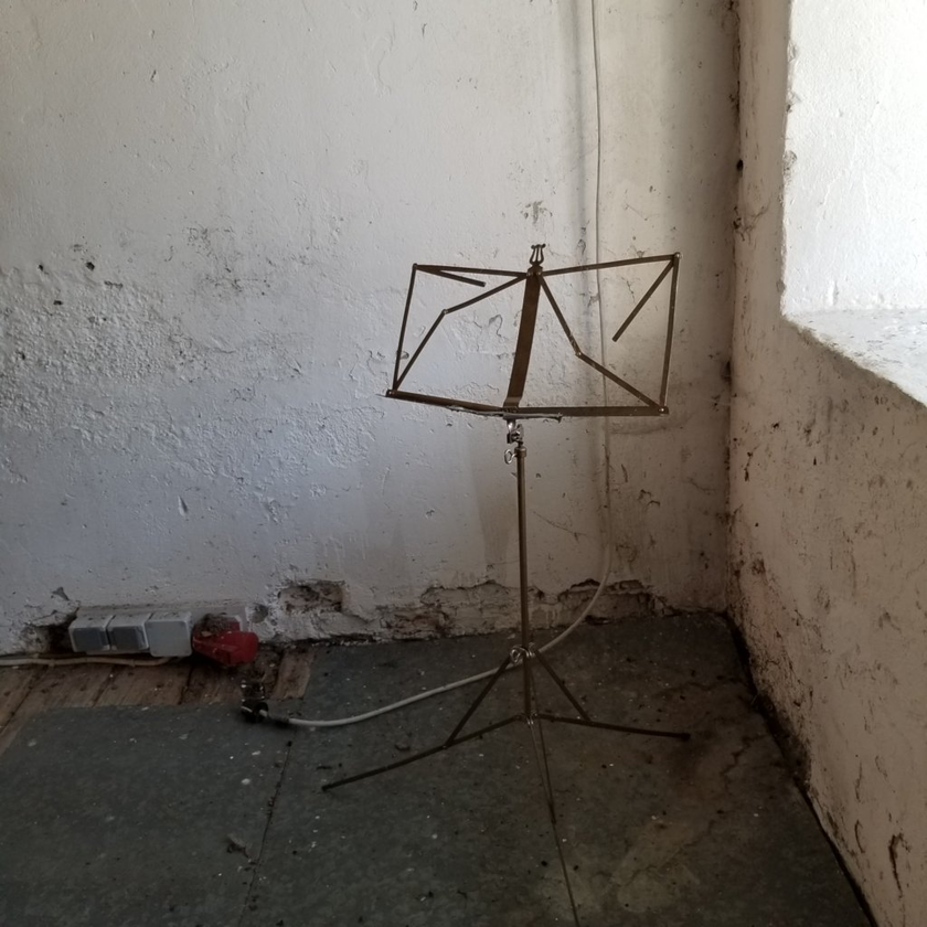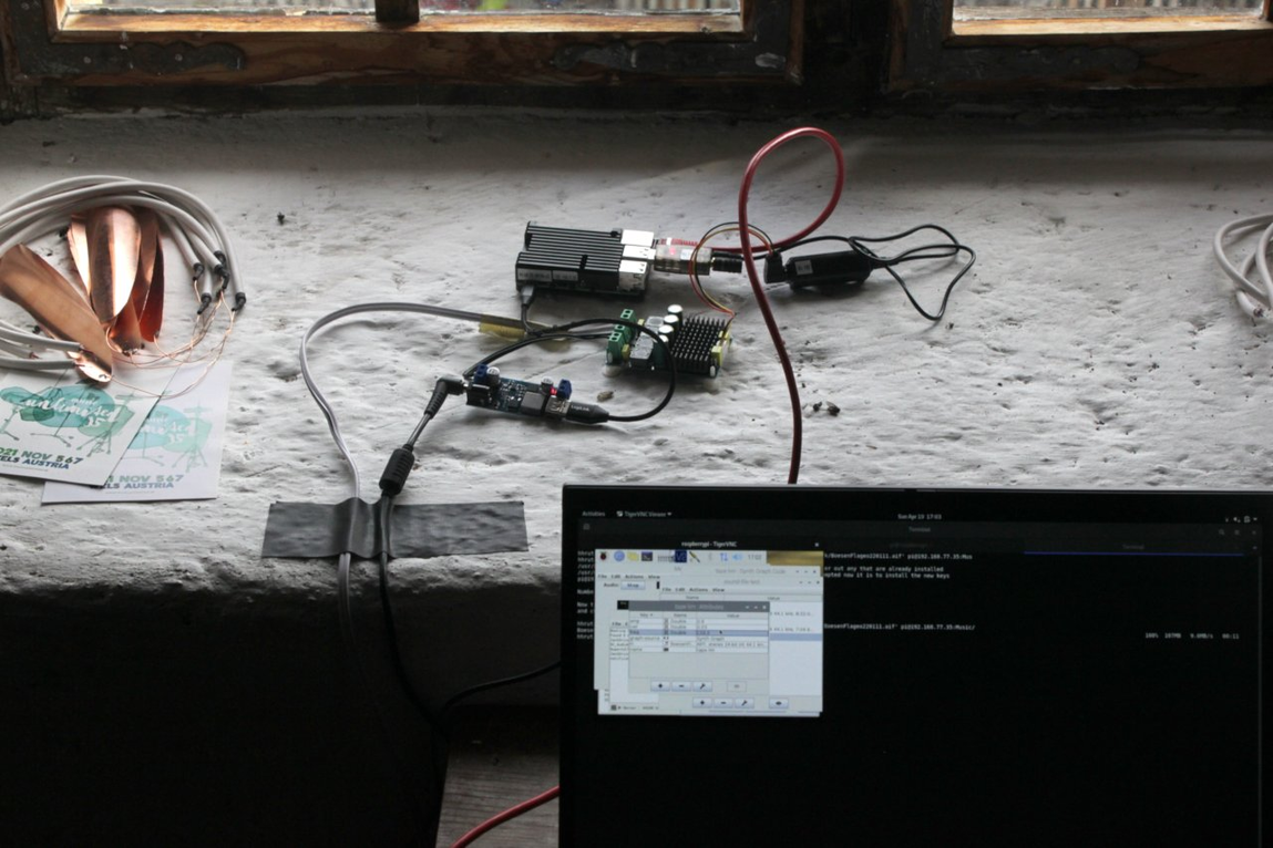A recording from Through Segments (2020) is used as a “test signal" to project sound via transducer on the metal plate. Another set of Pi and amplifier is placed here, the small tools are moved forth and back between the two buildings, and so is the small white Internet cube, as the Wifi signal from the main building is too weak here.
