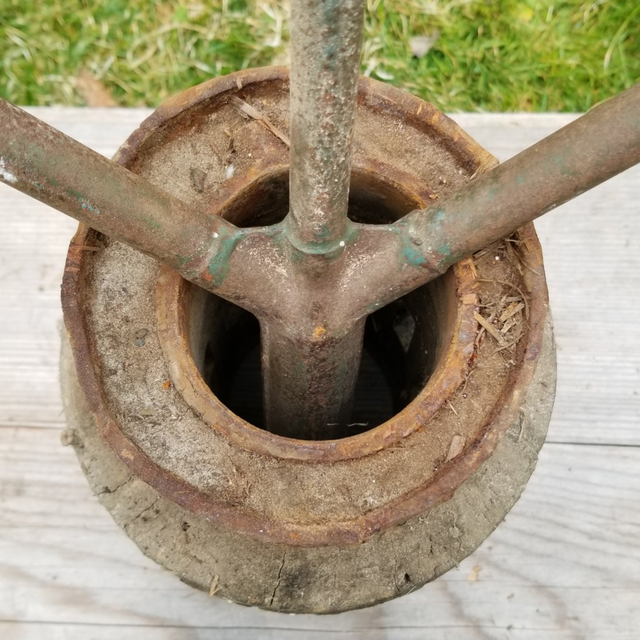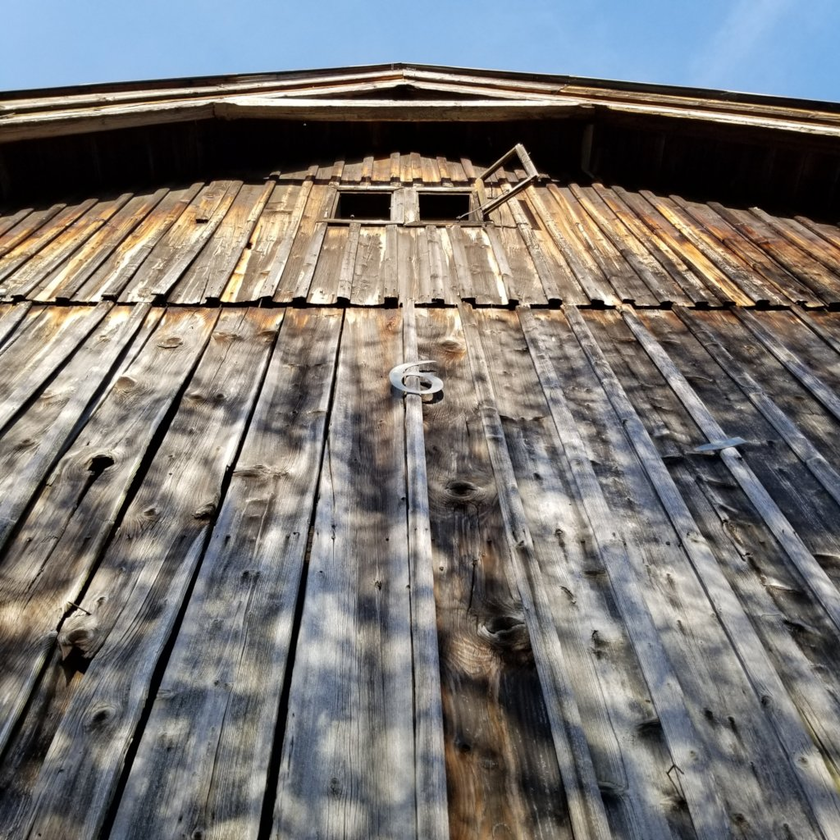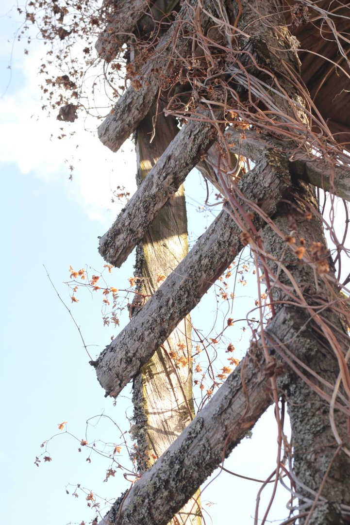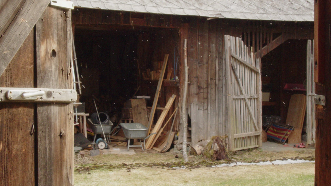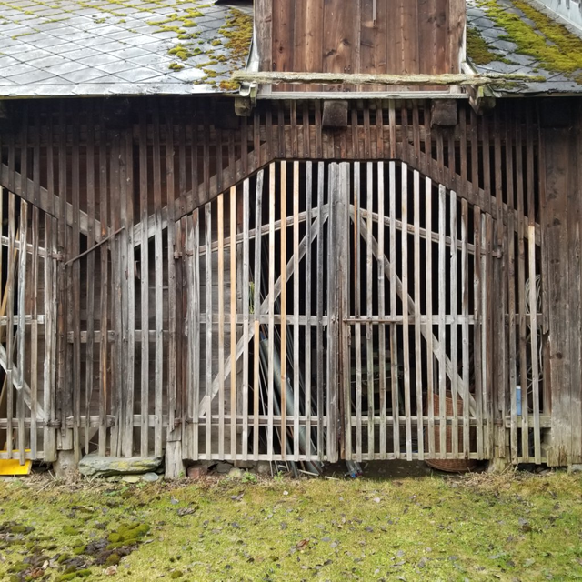 That steel cable is used by Hanns to hang another found object, a rusty metal plate, in one of the gates that could be opened in the wooden sheds across the yard.