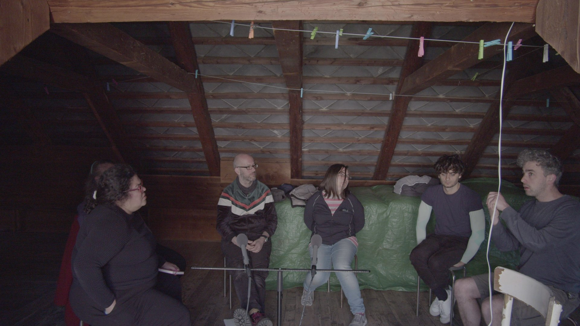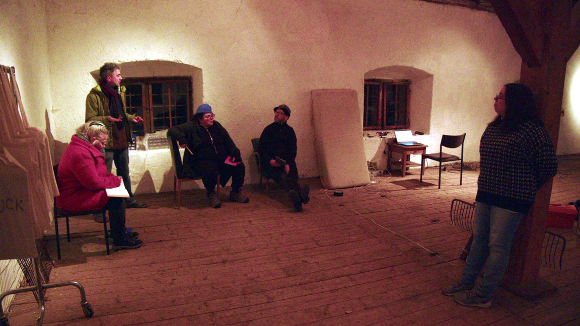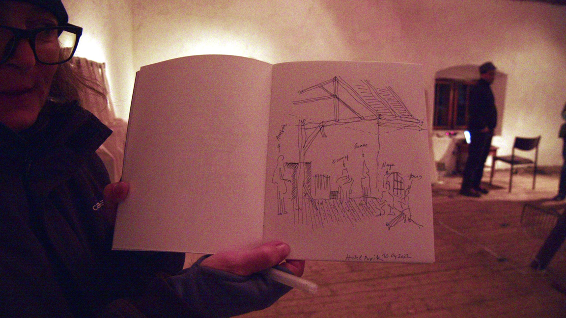 Up there, behind the metal plate, in the space that is used as sleeping place for additional artists during Hotelpupik’s festival, we gather for today’s meeting.