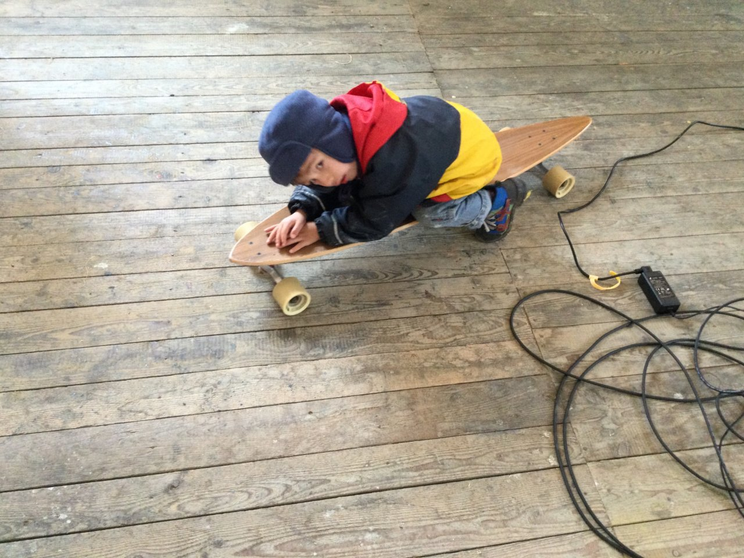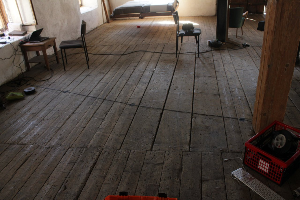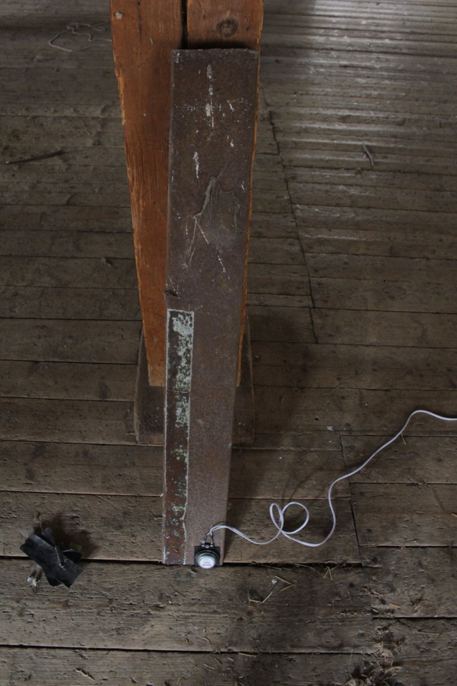 On the top floor of the shed, the recorded soundscape can now be heard through the suspended metal plate. A prominent sound landmark is the horn of the trains passing several times a day. Ultra-low frequency wind noises recorded by the microphones cause the plate to judder.