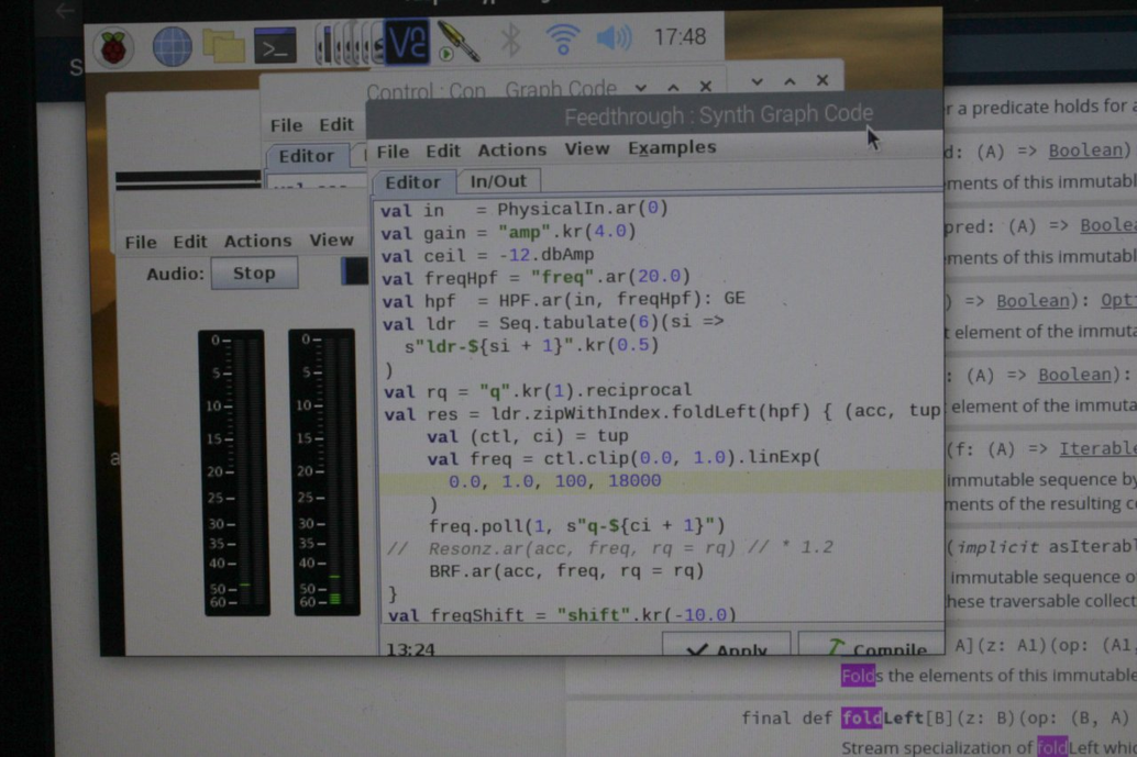 The picked up sound is run through a set of band-rejection frequency filters tuned according to the different signals of the light sensors mounted in the window frame. This signal is amplified and sent through a cable to the other side of the room, running through a transducer on the metal bar that is now suspended in the opened gate.