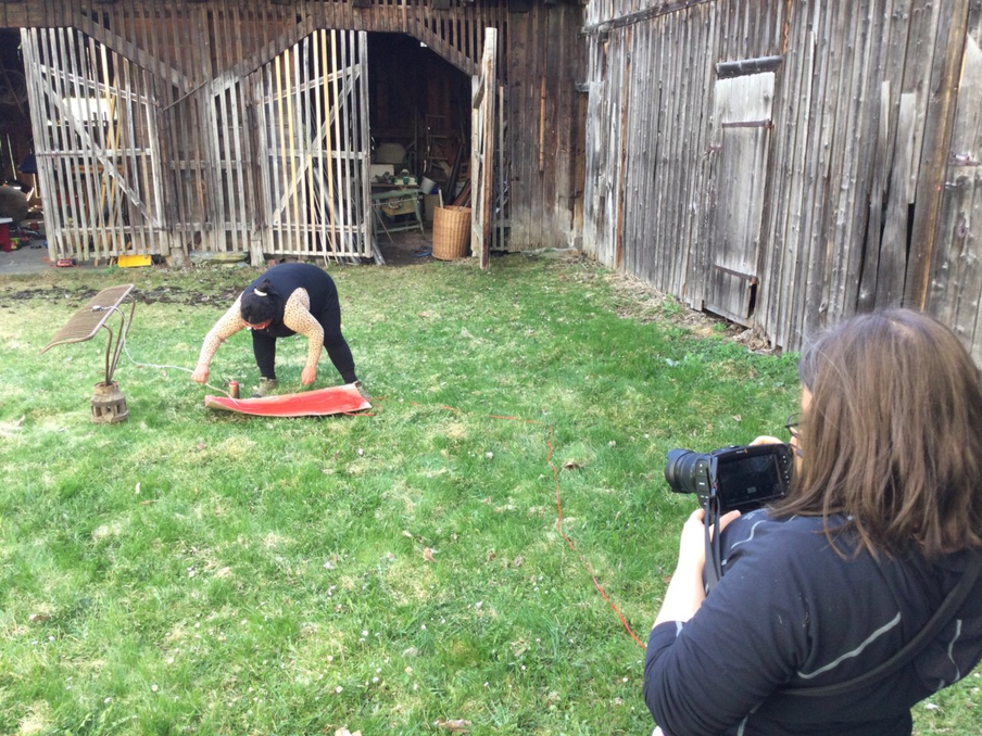 Naya began assembling found materials. We brought down the large rake, which was combined with a round wooden object and a wooden box as base. The transducer was still attached to the rake, the cable now running down from the first floor storehouse, and getting repainted in red.