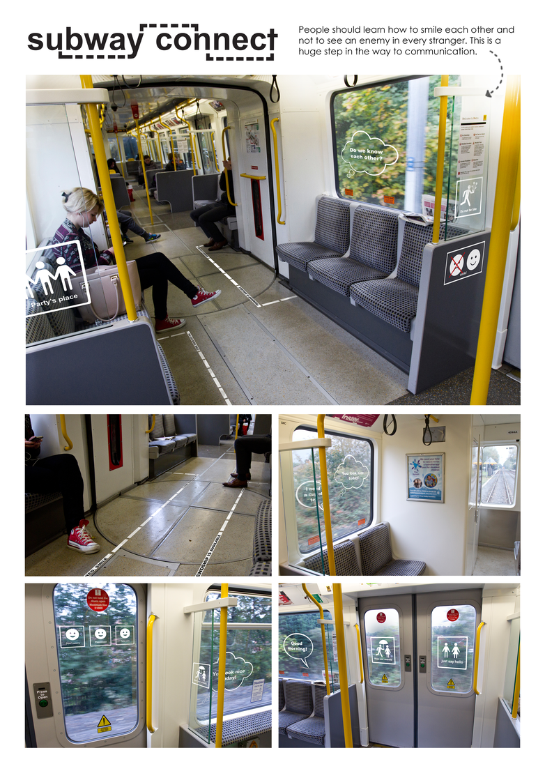Subway Connect was our attempt at sparking spontaneous interactions between strangers on the Oslo Metro, through graphic design. We placed pictograms and messages encouraging people to take notice of their fellow passengers next to the common warning signs inside the trains, but as it turns out, people aren’t really into being told what to do.