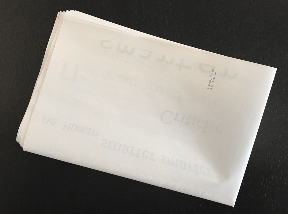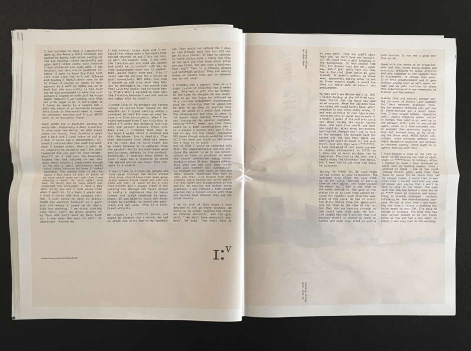 «Turning Negativity»— a newspaper that displays complaints from strangers (collected in the subway, on the streets, at work and around the net) in an alluring, new form. Recorded words of misery were processed by an online poetry generator— turning them into curious sentences, and images of trash were crafted into abstract artwork. The result was a piece of printed ephemera to remind us that everyone has the power to turn everything— even solid negativity, into something ravishing and valuable.
