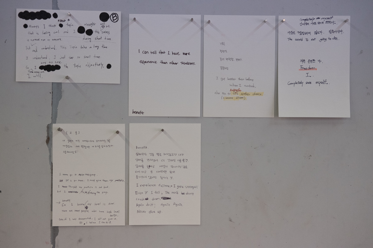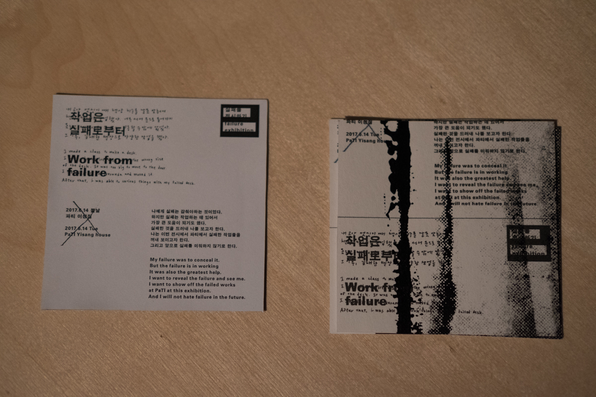 The benefit of Failure is a project started by S.O.D. in South Korea in March 2017. Our work is the result of several three to two days workshops where we try to visualise the benefit of our own failures.