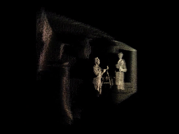 Brass Art work with scanning technologies such as 3D (Lidar) and 4D (Kinect on-range sensors) to capture collaborative performances in unusual settings. The research foregrounds Virginia Woolf’s stream of consciousness as a performative method to record the artists’ presence in her Writing Room (Rodmell, UK). The project necessitated a great deal of care as the tiny museum space is usually viewed from behind glass, by the public. Brass Art captured the dynamics of this threshold space without leaving a physical trace. In daring to progress their experimental performative approach using ‘colour filters’ to disrupt the binary shadow realm and exploring the future potential of virtual reality - Brass Art aim to bring this muselogical setting alive for new audiences.