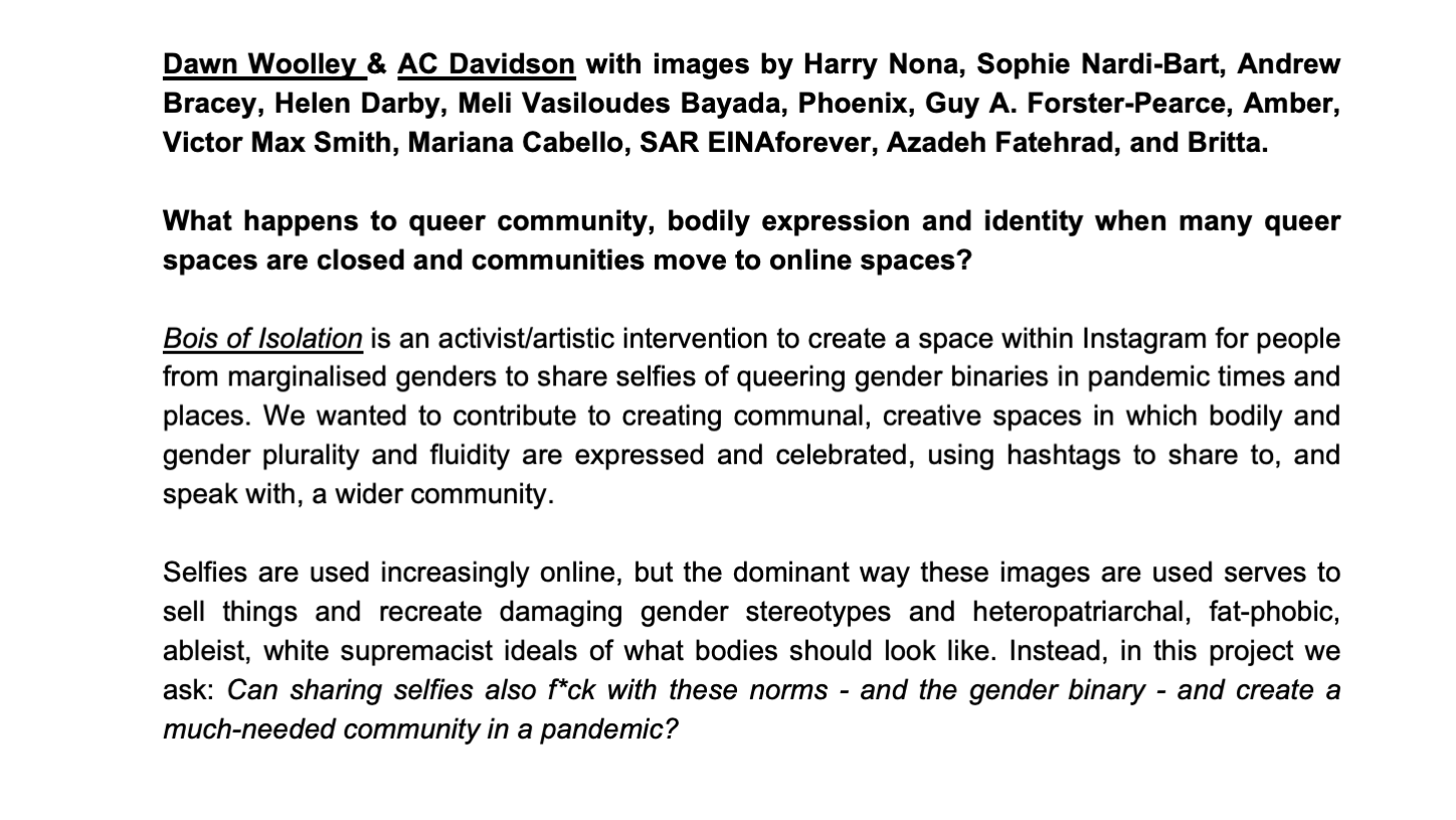 What happens to queer community, bodily expression & identity when queer spaces are closed & communities move online? This workshop critically reflects on, & invites participation in, the collaborative project Bois of Isolation: An Instagram platform for people of marginalised genders to share selfies of their spaces & processes of queering gender binaries in the pandemic. The project uses hashtag commons & selfies to challenge the hegemonic visual culture social media can perpetuate: Binarised gender stereotypes, exclusion of bodies deemed ‘other’, & hierarchies of value in which white, able-bodied, heterosexual, young & ‘healthy’ are supreme. Bois of Isolation contributes to communal aesthetic spaces in which bodily & gender plurality & fluidity are expressed & celebrated.