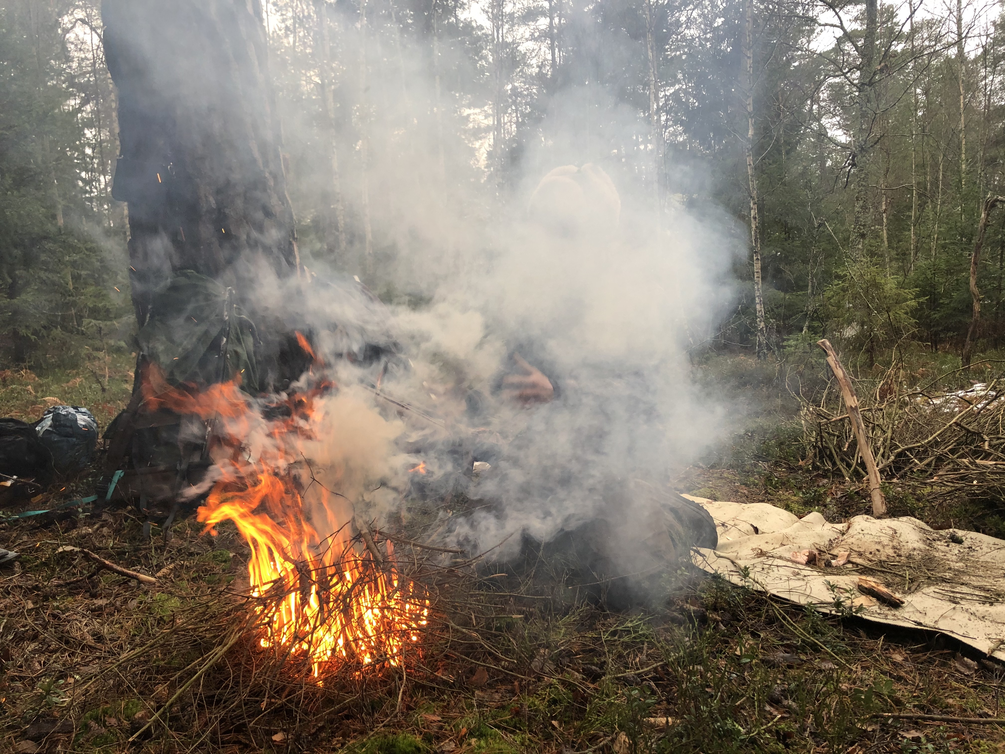 Jag ser på en bild av elden när den precis har tagit fart i de tunna grenarna och den konstnärliga ledaren X har blivit helt insvept i ett rökmoln så nästan bara hans hand syns. Det som framträder starkast på bilden är ett vitbeiga skinn, elden och röken. Genom bearbetningen av minnesanteckningarna får också skinnet en stor roll. Det kändes som att skinnet hade en stor plats i Xs vardag och att det hade många olika funktioner. Händelsen skapade en nyfikenhet hos mig över noggrannheten och närvaron med det vardagliga görandet som att göra eld kan vara. Detaljerna i förberedelserna, hanteringen av materialen för elden. Relationen mellan det mänskliga och det icke-mänskliga blir intressant.