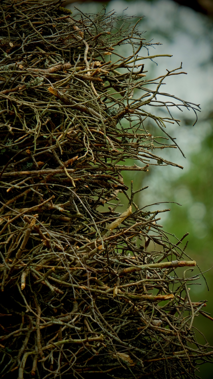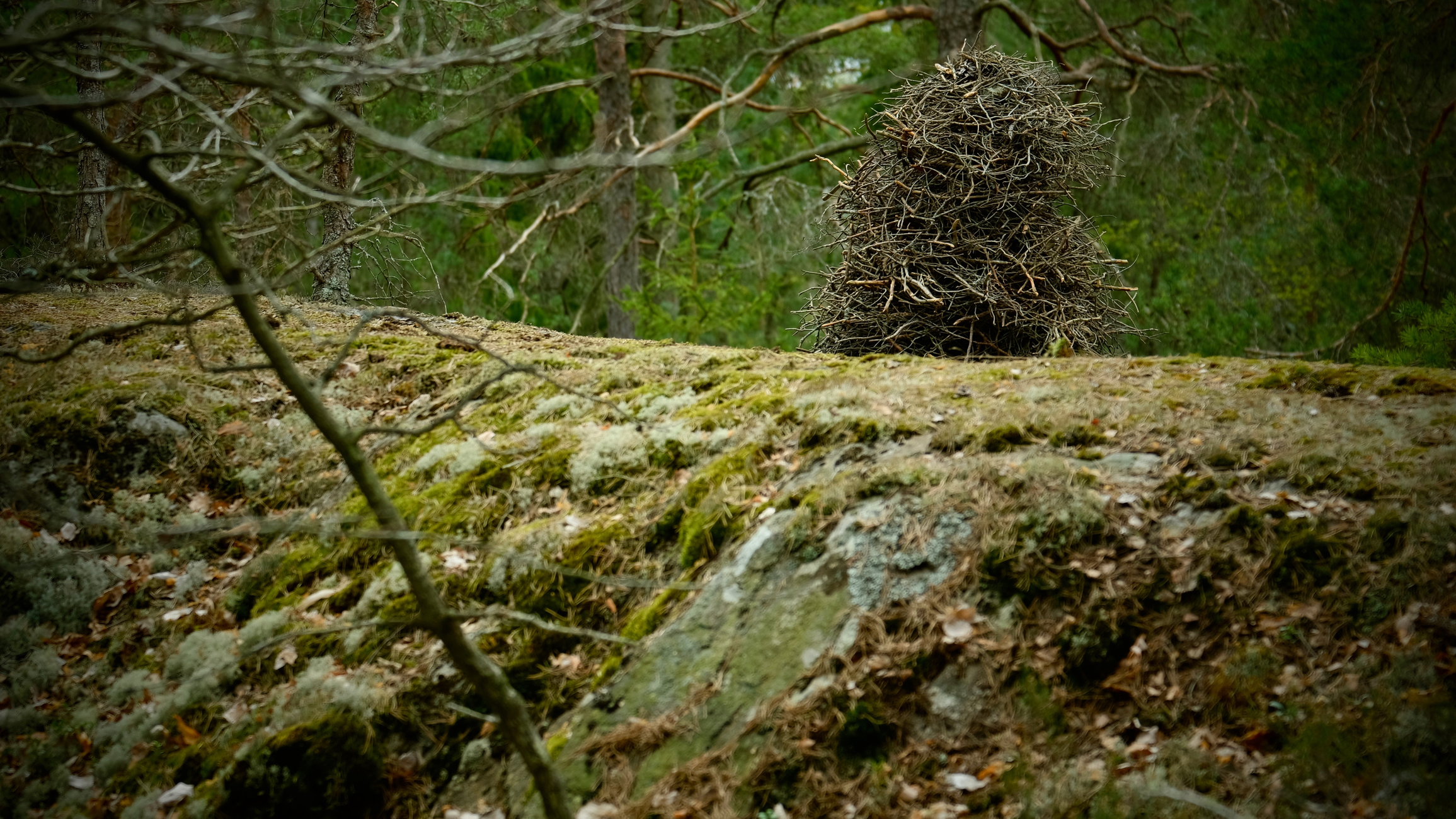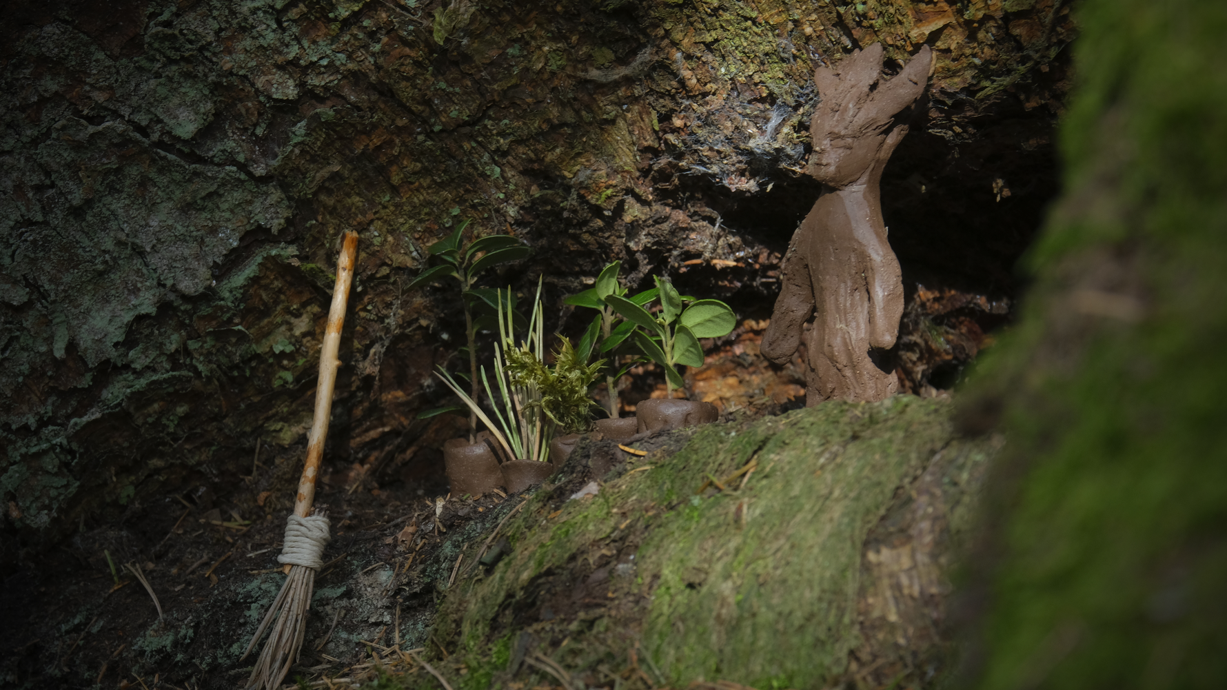 X borstar av gren resterna med sina händer, rullar varsamt ihop skinnet och fäster det på sin ryggsäck. Det känns som något ursprungligt i hur materialet används, en historia om andra tider och liv på andra platser. Materialet är fortfarande sig själv med sina naturliga egenskaper, det skyddar, andas och lever och kan finnas oändligt länge i sin nya form.