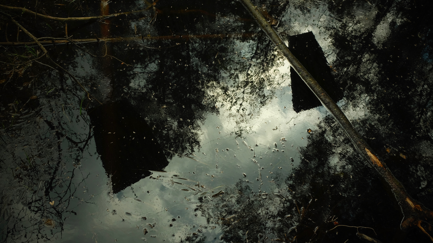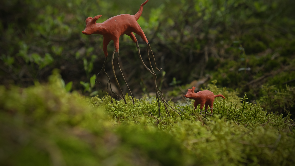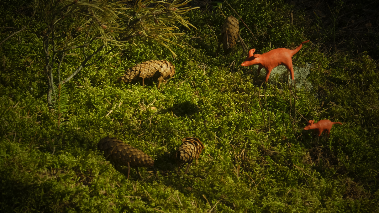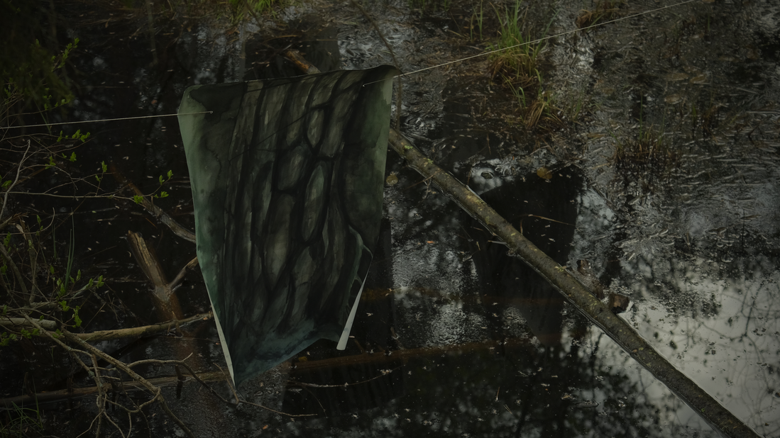 X borstar av gren resterna med sina händer, rullar varsamt ihop skinnet och fäster det på sin ryggsäck. Det känns som något ursprungligt i hur materialet används, en historia om andra tider och liv på andra platser. Materialet är fortfarande sig själv med sina naturliga egenskaper, det skyddar, andas och lever och kan finnas oändligt länge i sin nya form.