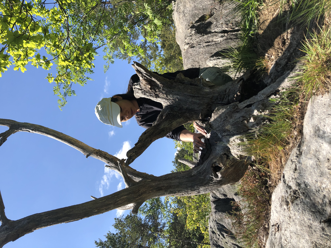 Jag sätter handen framför munnen och blir medveten om luften som passerar ut och in genom mina näsborrar. Nu riktar jag all koncentrationen uppåt mot den blåa himlen, tunna nästan osynliga moln gör att himlen är i rörelse och de höga magnifika trädtopparna svajar meditativt av den lätta vinden. Tankarna saktar ner och jag landar i skogen igen. Min blick lämnar den blå himlen och tittar in i skogen. Jag återupptar det performativa uppdraget att promenera tyst. Nu känner jag frihet att få upptäcka skogen på mitt eget sätt i sällskap med Mallika. Vi kommer fram till berget och sätter oss ner på en gammal trädstam som ligger ner för att sedan börja skriva minnesanteckningar över händelsen. När vi är klara finns en spänning i luften, fokuset ligger nu i det mänskliga, det känns som att vi håller andan, när och vem bryter tystnaden?