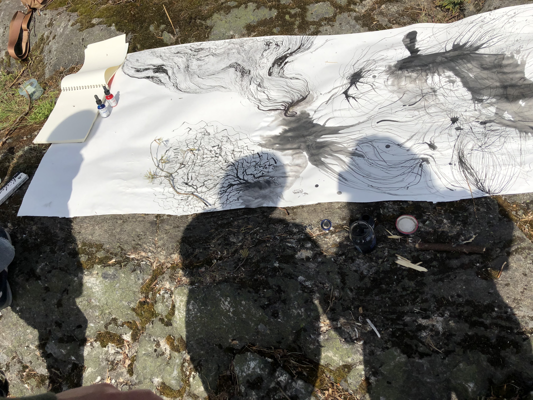 Efter den tysta promenaden och smygandet på skogen behövde Mallika och jag diskutera våra upplevelser. Vi hade tagit med ett jättestort papper och bläck av olika färger till skogen. Vi bestämde oss för att prova en så kallad “målande diskussion” med syftet att undersöka våra erfarenheter av händelserna. Genom det gemensamma tecknandet med material blir skogen nu ett pedagogiskt rum, där vi brukar skogens material men närvaron är mest riktad till den social aktiviteten. Det konstnärliga resultatet blir också sekundärt och fokuset är i mötet med material, människor och tankar.