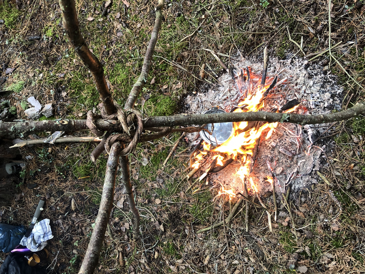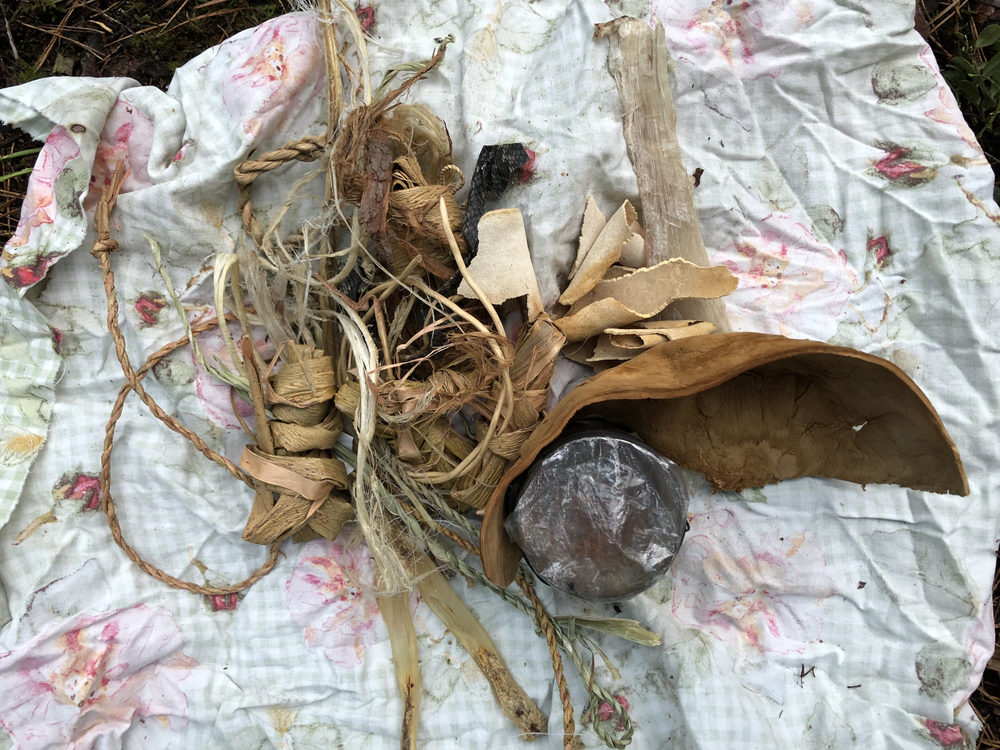 Eld är enligt mig alltid häpnadsväckande men den nya erfarenheten var att X visade upp hur man gör eld som en konstart. Förberedelsen av materialet gjordes med sådan vördnad, noggrannhet, koncentration och största närvaro. Vi fick beskåda ett hantverk där de eldstärkande materialen behandlas som smycken av guld och ädelstenar när de placerades ut på skinnet. Materialen bands samman till ett fågelbo för de första gnistorna från bågdrillen. Fågelboet började ryka och X tog det i sina händer och höll det högt upp i luften, när de första lilla flamman syntes skingrade sig röken och elden tog fart. Det var en sensation och jag fylldes av förundran, elden lystes upp i händerna och när flammorna slog upp var det som om vingarna vecklades ut på en fågel som flög ut från boet.