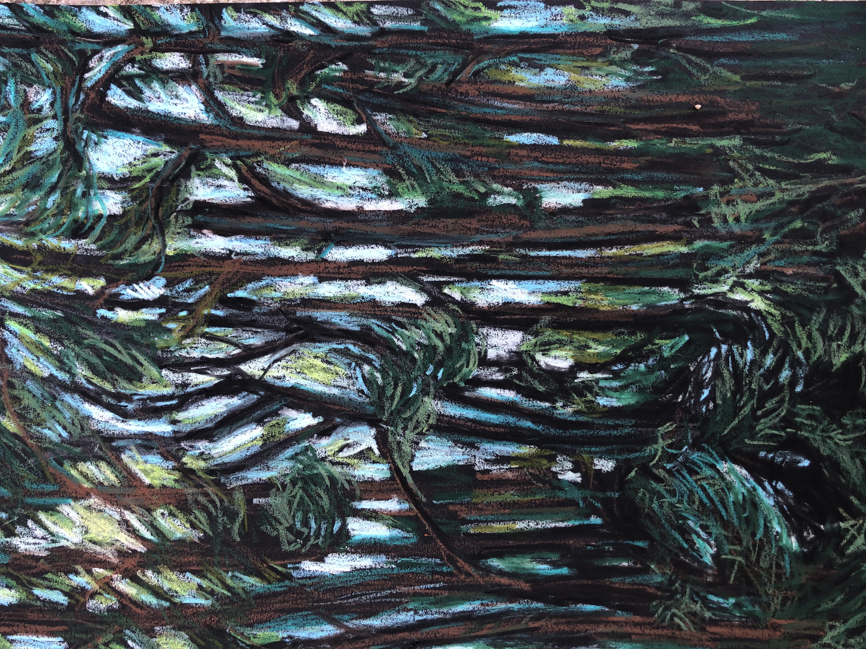 Tystnaden uppfattas inte som lång när man målar, men i en diskussion utan ett görande skulle tystnaden antagligen bli avbruten med ord för att inte bli obekväm. De tysta pauserna i diskussionen ger mer respons till samtalet när orden kom tillbaka. Pinnarna raspar ut färgen i vilda linjer, vatten och bläck skapar stora pölar. Våra rörelser är intensiva liksom orden som flödar obehindrat mellan helt blandade ämnen, vilket skapar oväntade idéer och tankar som knyts ihop och förbättrar vår förståelse i samtalet. Det känns som att skogen och görandet får oss att fokusera mer på samband i det vi utforskar och hur vi upplever att allt hör ihop med varandra.