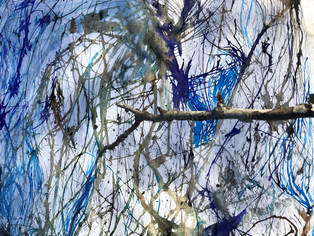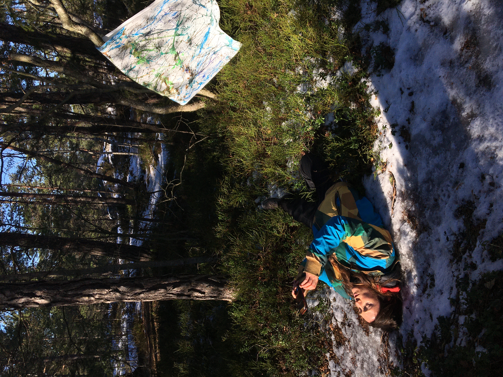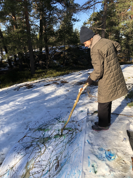 Vi rullar ut det stora pappret över den hårda snön på berget, papperet rullar ihop så man får lägga tyngd på ändarna. Skogen får bidra med material till att måla med, samlingen av penslar är olika längder på pinnar, grenar med barr och lite mossa. Vi doppar pinnarna i bläck och vatten och sätter igång att måla. Pinnarna har dålig uppsugningsförmåga så det skapar bara klena torra linjer på pappret. Vi häller ut pölar med vatten på pappret och droppar olika färger i pölarna. Nu börjar linjerna ta fart, vattnet blandas med färgerna och pinnarna kan föra iväg färgen så att linjerna sprider sig över papprets alla delar. Först är vi rätt koncentrerade på att få igång målandet men efter en liten stund börjar det kännas flödande och med mer energi. Det är vackert att se de olika kulörerna blandas med varandra. Pinnarna ger ett visst motstånd, det är inte alls som att måla med penslar som glider smidigt över ytor utan pinnarna raspar och hackar. De större pinnarna blir som tunga käppar som kräver att hela kroppen deltar i målandet. Vi pratar med varandra, men det varvas med tysta pauser, rytmen i diskussionen blir intuitiv och tillåtande och flödar med färgen på pappret.