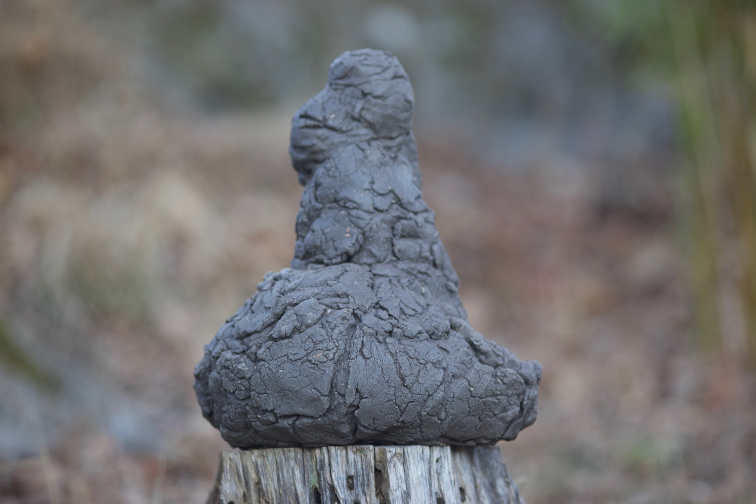 leran har fått barr och bark i sig, jag skulpterar och märker att det jag gör ser ut som en lerklump, leran med sina formvänliga egenskaper kan formas till nästan vad som helst av den erfarnes händer, nu stannar den i sitt ursprung och resultatet blir en lerhög, leran fortsätter att vara sitt material och föreställer sig själv