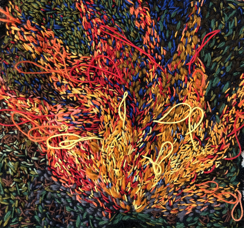 Tiden hantverket tar skapar utrymme för att tänka långsamt. Broderandet blev ett vardagligt görande. Trådarna gjorde att elden höll sig brinnande länge i mina händer. Det blev en paus för tiden och tanken. Här beskrivs hur broderiet gör att händelsen fortsätter att vara närvarande genom handen och materialet. Tankarna fortsätter vara i rörelse genom broderiet. Det bildas ett “släta rum” i görandet av den pågående multimodala dokumentation där händelsen får verka i det “ännu-icke-sedda”. Genom Deleuze och Guattari beskriver Lotta Johanssons begreppet "ännu-icke-sedda" med att det inte är uttryck för någon progresiv utveckling utan för en oriktad förändring åt endera hållet. Det är en geografisk och rumslig förståelse av hur det ännu-icke-sedda tillvaratar det ovissa.83 Beskrivningen passar in på hur elden växer fram genom ett mållöst görande. Det är som om jag gör något fast ändå ingenting. Minuter, timmar och dagar går och den tunna linne biten har nu transformerats till en tjock massa av färgsprakande material. Att skriva att jag gör något men sen ändå ingenting kan också tolkas som en slags förnekelse av materialet och hantverket. Jag förnekar krafterna i linnetyget, nålen och tråden, men också den dialog som uppstod i arbetet med materialet och vilka effekter det hade på olika plan.