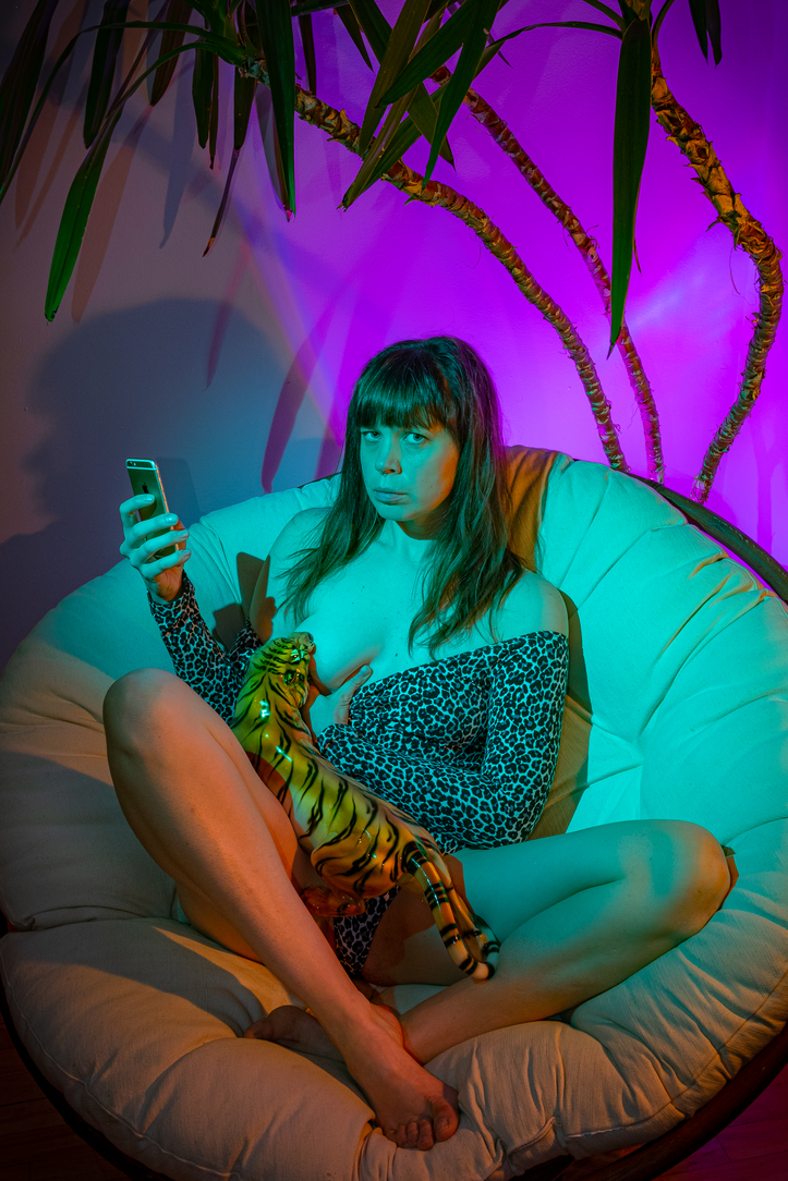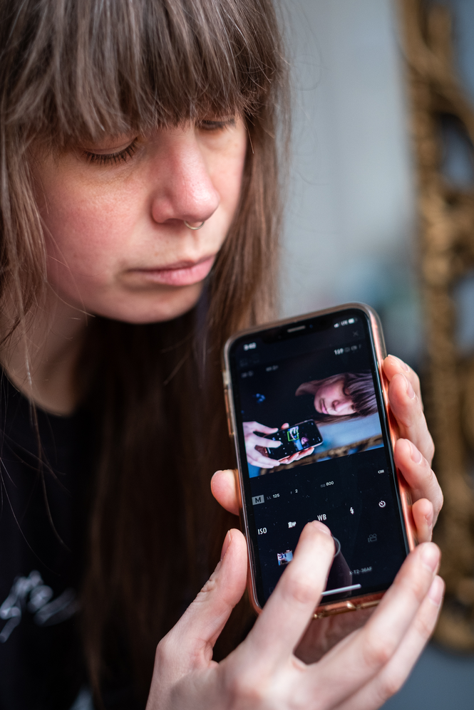 Depuis la pandémie, le temps que j’ai passé sur les réseaux sociaux a drastiquement augmenté. Ça m’a permis de développer une nouvelle relation avec mon iPhone et mon appareil photo. Mon cellulaire apparaît dans tous mes autoportraits. Alors que certains pourraient y voir une critique, c’est en fait mon processus de prise de vue que je donne à voir : il est mon moniteur et le déclencheur de ma caméra. L’image commence et termine dans mon téléphone.