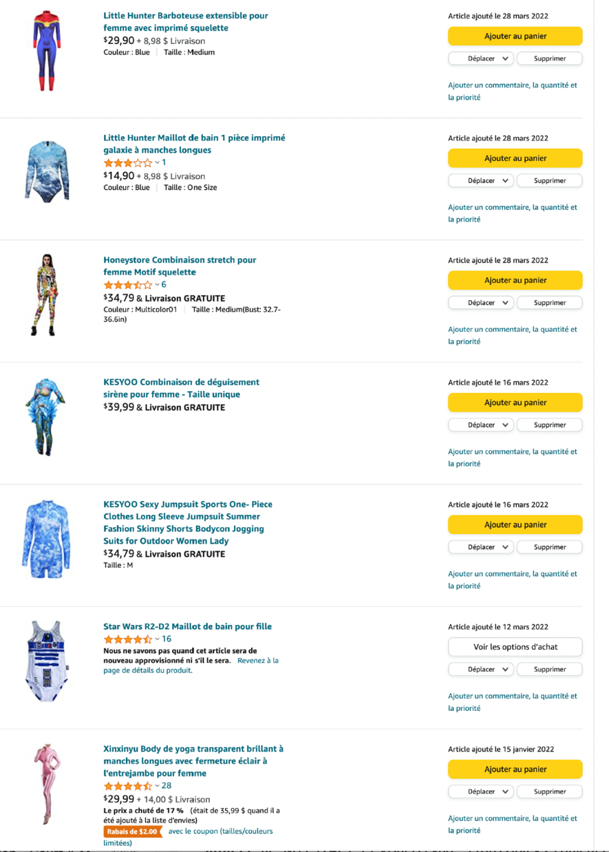 Mon processus est aussi dépendant de longues heures passées à magasiner sur Amazon et AliExpress. J’y cherche des combinaisons moulantes et des accessoires, et les bas prix et la rapidité de livraison sont mes critères principaux. Ces combinaisons deviennent ma deuxième peau et me permettent d’entrer dans un jeu symbolique de la représentation.