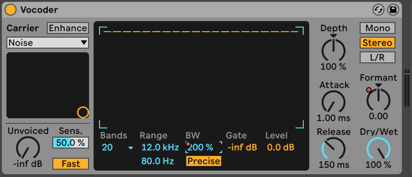 I then continued with the Ableton Vocoder. This is a tool I often use to generate faint high frequency crackles to mix with the source sound, a method of introducing ”crispness” in a mix, and it definitively belongs to the earlier mentioned category of ”unusual tips” one would find in mixing and production tutorials online.