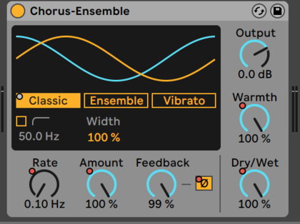 I proceeded to experiment with the Chorus-Ensemble-plugin. Using this tool, I could generate squealing and pulsating sounds with rising and falling pitches. Here the oscillating of the chorus became the main instrument. It had similar qualities to the sounds generated by SOPHIE that had peaked my original interests.
