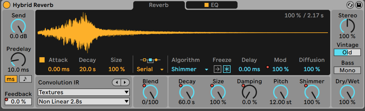 After recording with this setup for a little while I started experimenting with Abletons Hybrid Reverb. The Hybrid Reverb is, as I interpret it, designed to be a more ”high end” alternative to the standard Ableton Reverb. It contains a few different algorithmically generated reverbs that can be mixed as desired with convolution reverbs recorded either by Ableton staff or yourself.