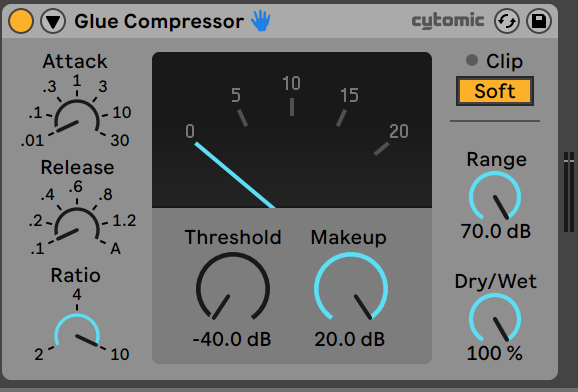 I stacked different amounts of copies of the Ableton Glue Compressor. They were all set to the same settings with attack and release both at shortest possible length at .1 and .01 seconds each, and ratio at x10. The threshold was set at lowest possible -40.00db while the makeup gain was maxed out at 20.00db. The dry/wet was at 100% and soft clipping was on.