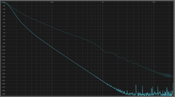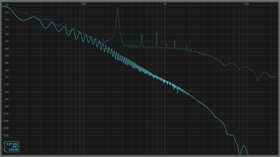 This can be contrasted with the spectrum post-compression, where every jitter in the overtone-levels become exaggerated, and part of the noise floor has also become part of the ”tone”, while part of it is too far removed in amplitude levels to even show up on the spectrum.