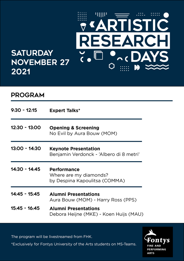 The Artistic Research Days are a joint initiative between the five Master programs of Fontys University of the Arts to celebrate Artistic Research as a fundamental methodology enhancing artistic and educational processes.