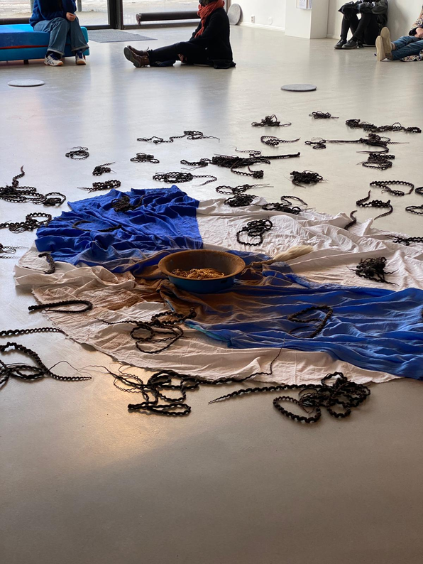 Performance - Lecture sharing extracts of performance works in dialogue with a text of the philosopher Kimbwandende Kia Bunseki Fu-Kiau a leading scholar of Bantu-Kongo cosmology—to explore how the references in this work unfold in her practice. Kimbwandende Kia Bunseki Fu-Kiau; African Cosmology of the Bântu-Kôngo: Tying the Spiritual Knot: Principles of Life & Living; 2nd Edition; 2001.