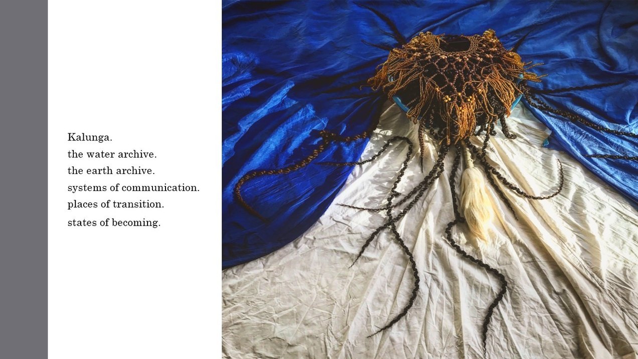 Kalunga is the threshold between the world of the living and the world of the dead. Above Kalunga is the world of the living, the physical world and below Kalunga the world of the dead, abode of the ancestors. Kalunga is represented by a liquid, permeable horizontal line, the sea, infinite movement that adheres to flows and transits. Kalunga is a set of creations that overflowed from the void. The set of where things start to become. The universal source that made all things happen in the past, makes things happen in the present and will make things happen in the future. Life itself. integrity of being. Liquid state. Movement. Interaction. Interaction as a manifestation of a way of existing in the world. Transitional place. States of becoming.