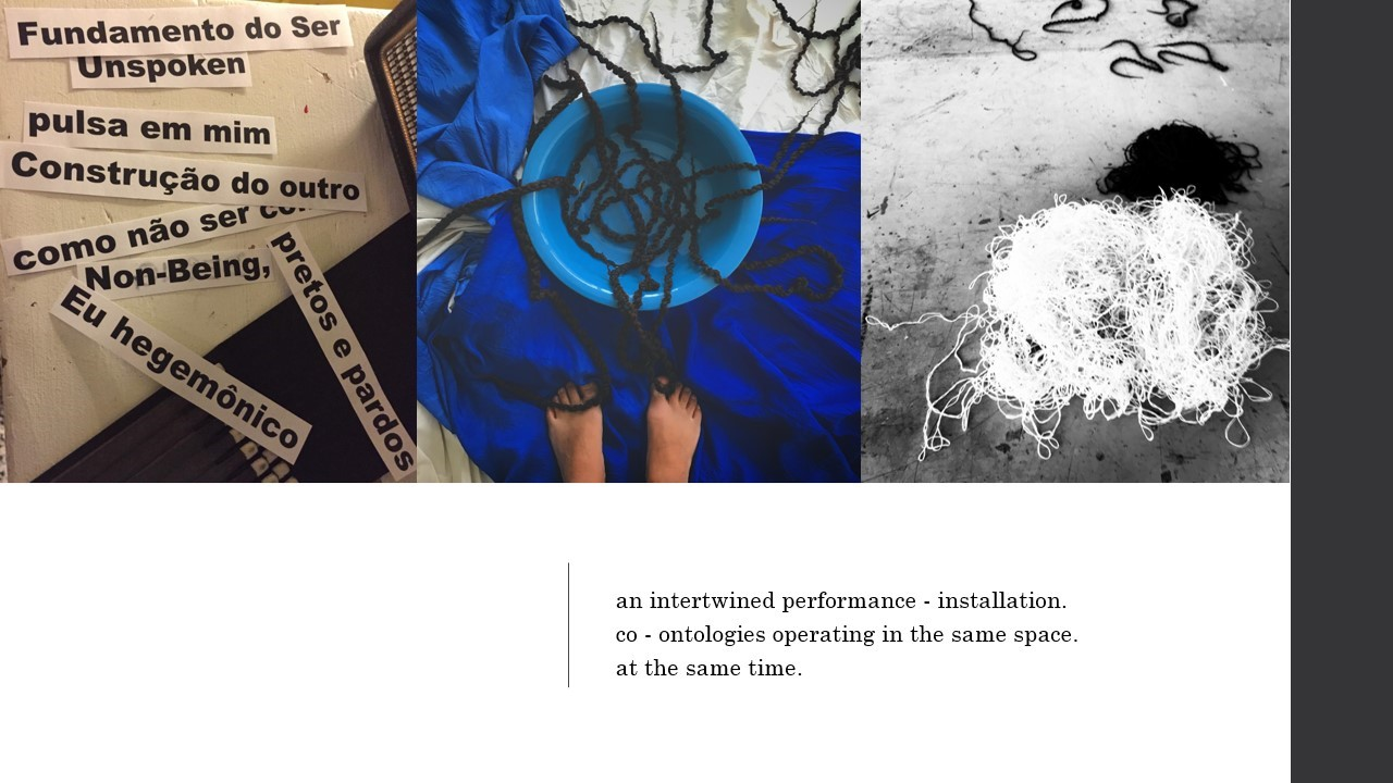 "Explores the interrelation between word and image as a place of speech. Searching for a synesthetic experience by exploring visual arts, sound, text and movement and installation in site-specific locations". Luanda Carneio Jacoel