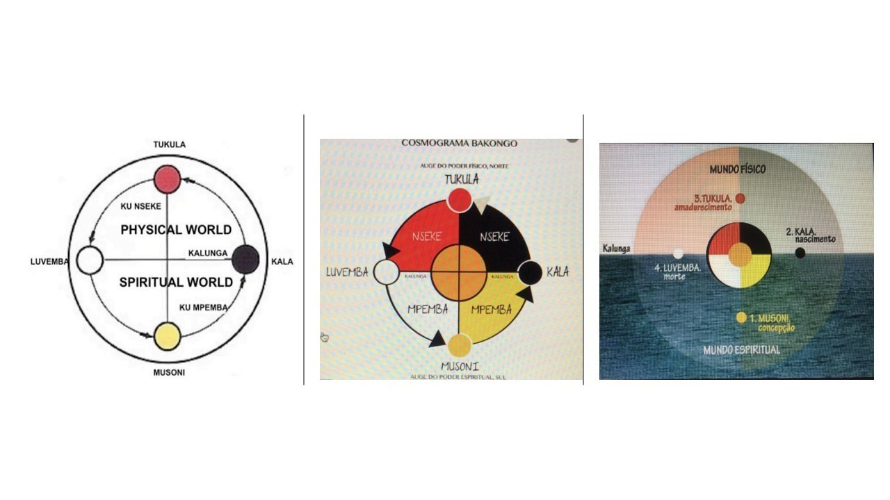 The dikenga dia Kôngo cosmogram precedes a cosmology that perceives the world not just in its immediate physicality, but as a network of interacting energies. All beings of nature, animate and inanimate, manifest themselves with different gradations of vital forces, which interact with each other, always seeking for balance. The notion and cultivation of ancestry are well known as the main source of maintenance of individual and collective vitality. Within a circle divided into four parts by a cross, we experience the stages of life, in a spiral perspective of time. The cosmogram is the representation of the trajectory of life, between the spiritual and human worlds.