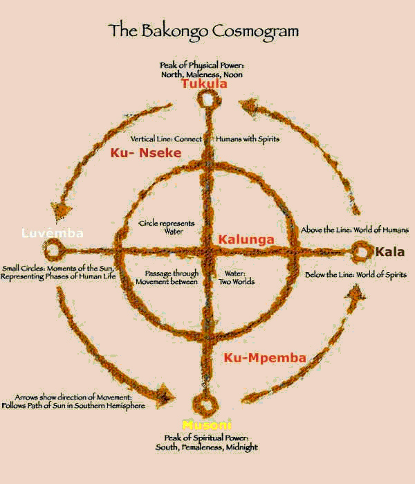“Kalûnga then became the symbol for force, vitality and more, a process and principle of change, all changes on the earth (Kalûnga walûnga mbûngi ye lungila yo wayika se n´kîngu wa nsobolo). And by cooling the mass in fusion (zenge - zenge/ladi diambangazi) solidified itself (kînda) and gave birth to the earth. In the process of cooling, (mvodolo/nghodolo) the matter in fusion (luku lwalâmba Nzâmbi) produced water, (luku lwasânda) whose rivers, mountains, etc., are the results ( Fu - Kiau, 1969). The world, (nza), became a physical reality floating in kalûnga (in the endless water within the cosmic space); half emerging for terrestrial life and half submerging for submarine life and the spiritual world. The kalûnga, also meaning ocean, is a door and a wall between those two worlds. Kalûnga became also the idea of immensity, (sènsele/waywa) that one cannot measure; an exit and entrance, source and origin of life, potentialities (n´kîngunzâmbi) the principal god-of-change, the force that continually generates. Because kalûnga was the complete life, everything in touch with the earth shared that life, and became life after itself. That life appeared on the earth under all kinds of sizes and forms: plants, insects, animals, rocks, human beings, etc.”