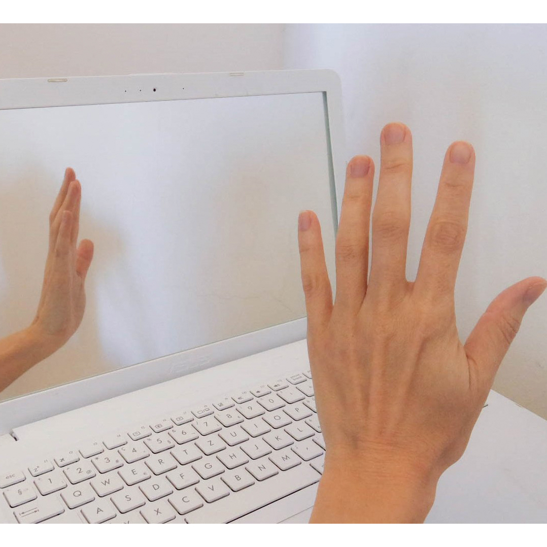 Los espejos planos pueden abonar la ilusión de una coincidencia exacta de los planos porque en el plano temporal no hay desfasaje, el reflejo es simultáneo por ser una tecnología analógica que no implica la mediación de una señal analógica o digital, por ejemplo, televisión abierta o streaming. Entonces en el caso de la computadora-espejo la sustitución de la pantalla por un espejo ha implicado el pasaje del descentramiento a la inversión. Esto puede observarse en las foto-performances al comparar el borde derecho de la mano tomada por la cámara con su reflejo en el espejo, aunque habrá que tener en cuenta que en este caso el reflejo se complejiza por la posición de la cámara.