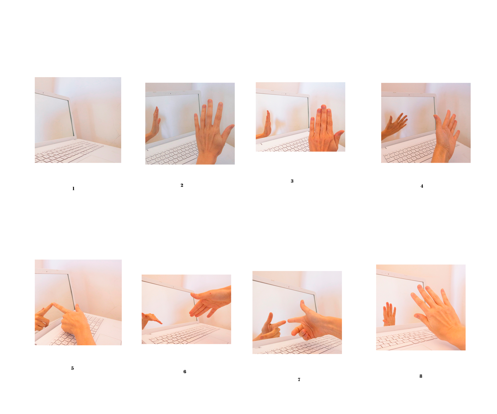 Sin embargo, dado que la primera fotografía de la secuencia presenta a la computadora-espejo sin la interacción de un cuerpo, se anticipa que cualquier cuerpo podría acercarse allí, como efectivamente se muestra a partir del siguiente cuadro. Es decir, si la computadora-espejo es un objeto con el cual cualquier otro cuerpo podría realizar una interacción y fragmentarse allí, entonces la fotografía podría acercarse al registro en caso de que la situación instalativa estuviera disponible para un espectador.