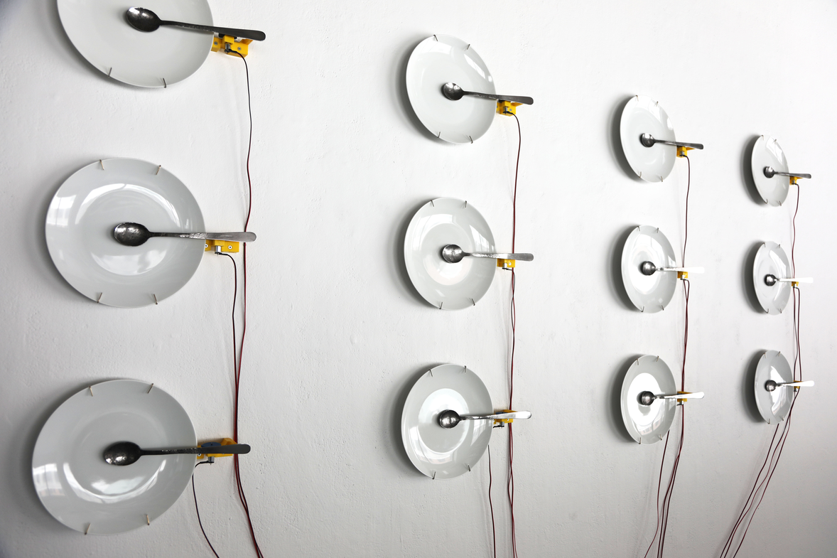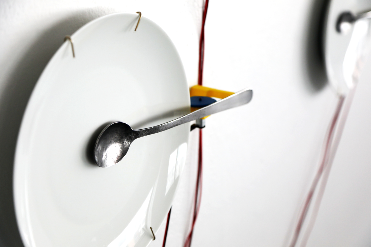 À travers l’exploration de l’ordre et du désordre, j’utilise la répétition d’éléments. Dans l’œuvre À la soupe, ces éléments, mis en action, créent une agitation sonore et physique où les cuillères, positionnées de façon systématique et actionnées au moyen de moteurs, tapent dans leur assiette respective. La céramique des assiettes et le métal des cuillères qui frappent sur ces dernières génèrent un son qui n’est pas angoissant à l’excès, mais suffisant pour assurer une présence notable. Une forme de résistance appelant à un moment d’éveil. J’utilise la représentation d’objets usuels qui évoquent des symboles et interroge la potentialité d’objets familiers. Les pièces sculpturales sont empreintes d’un côté ludique et deviennent des allégories de systèmes sociaux ou même politiques.